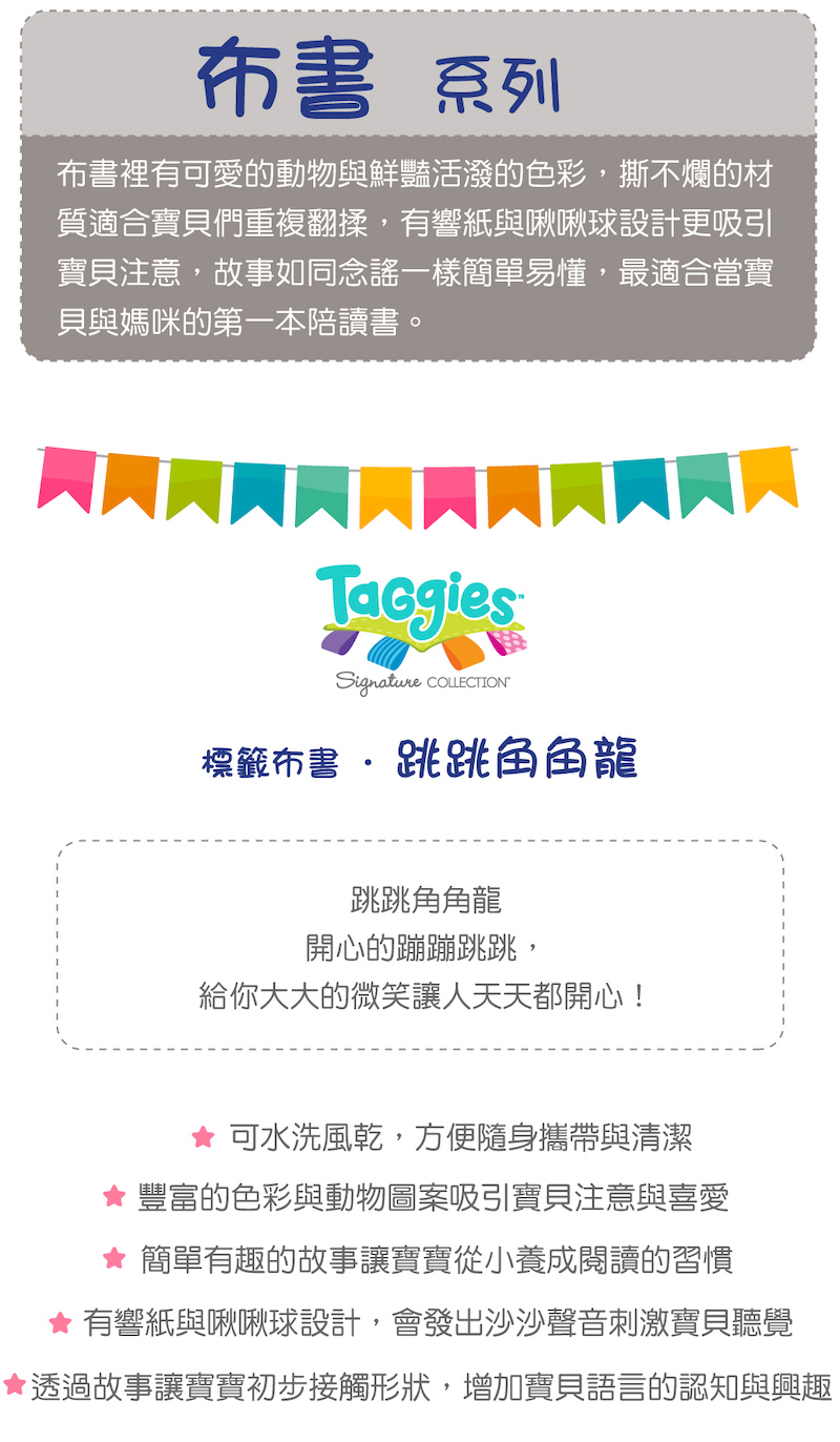 ●全柔軟布料的布書。●為寶寶與媽咪帶來微笑的8頁小故事。●結合寶寶喜愛的沙沙紙。●結合寶寶喜愛的緞帶標籤。●吸引寶寶的注意力。