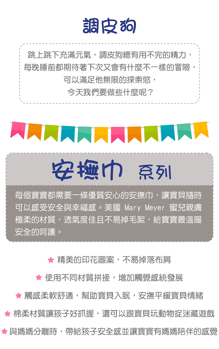 ●跳上跳下充滿元氣,調皮狗總有用不完的精力,每晚睡前都期待著下次又會有什麼不一樣的冒險,可以滿足他無限的探索慾,今天我們要做些什麼呢?●最受孩子喜愛的調皮狗,中性顏色配色,燦爛的笑容,帶來一整天的好心情。●寶貝最愛打結的角落。●優雅配色、精緻的細節。●安全柔軟布料適合孩子抓握。●纖細柔軟不傷害寶寶柔嫩肌膚。●不同的布料刺激觸覺,有效的安撫寶寶。商檢字號 M38876