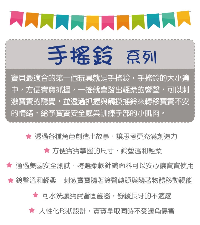 ●淘氣狐狸水汪汪的大眼,轉啊轉的探索這個世界,活潑的穿梭在綠野森林的每個角落。●暖色系的橘紅色佐以白色點綴,完美展現狐狸的活潑與可愛。●完美適合小手的尺寸易抓握,讓寶寶輕鬆訓練小手的肌肉。●安全柔軟布料,纖細柔軟不傷害寶寶柔嫩肌膚。●商品聲響設計,可刺激寶寶聽覺,亦適合寶寶手指動作練習。