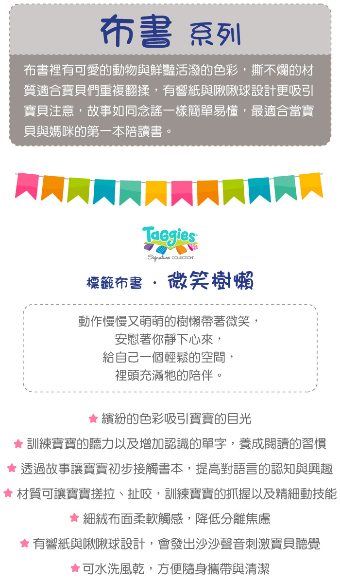 ●微笑樹懶-慵懶的肢體搭配超可愛的表情,療癒了媽媽,逗樂了寶寶,就要被融化了!●全柔軟布料的布書。●為寶寶與媽咪帶來微笑的8頁小故事。●結合寶寶喜愛的沙沙紙。●結合寶寶喜愛的緞帶標籤。●吸引寶寶的注意力。