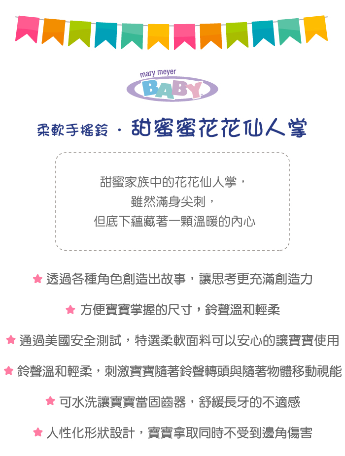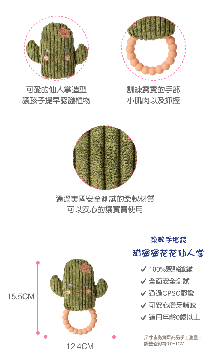 ●甜蜜家族中的花花仙人掌,雖然滿身尖刺,但底下蘊藏著一顆溫暖的內心。●完美適合小手的尺寸議抓握,讓寶寶輕鬆訓練小手的肌肉。●安全柔軟布料,纖細柔軟不傷害寶寶柔嫩肌膚。●商品聲響設計,可刺激寶寶聽覺,亦適合寶寶手指動作練習。