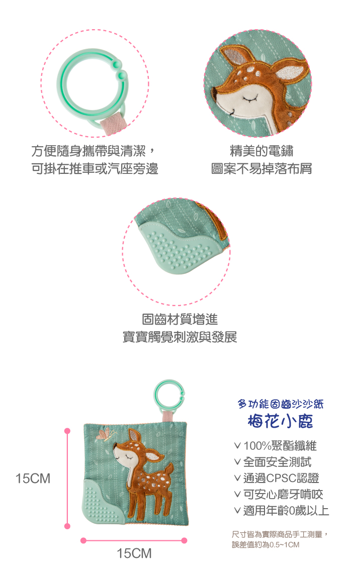 ●最親近寶寶的梅花小鹿,溫暖陪伴在你身邊。●靈活的拉環,可連接嬰兒車和嬰兒床,隨身好攜帶。●內有寶貝最愛的沙沙紙,可有效安撫寶寶的情緒。●不含BPA,PVC和鄰苯二甲酸鹽等有害物質。●轉角固齒器的設計,讓口腔期的寶寶可以安心恣意的啃咬,滿足寶寶的需求。