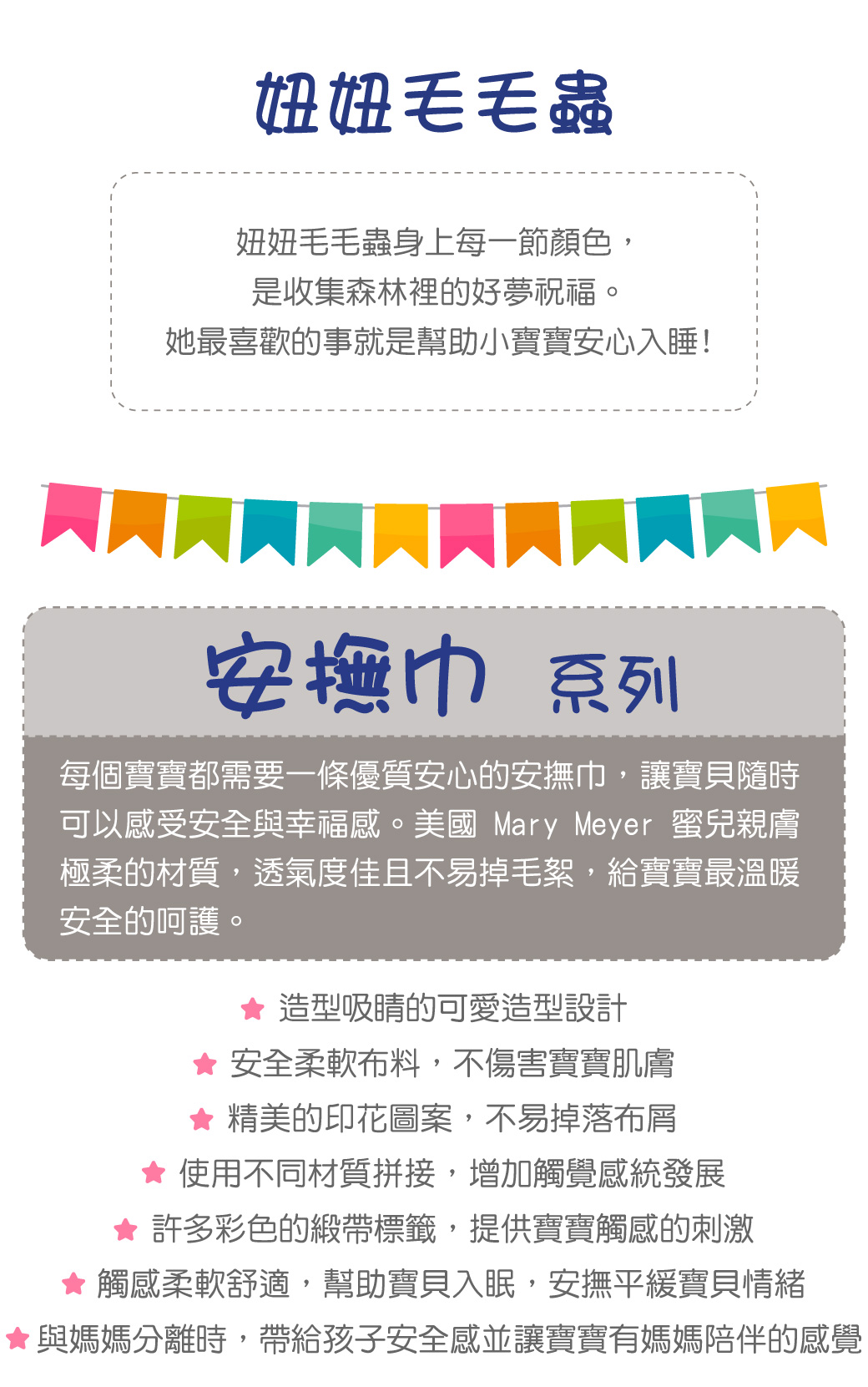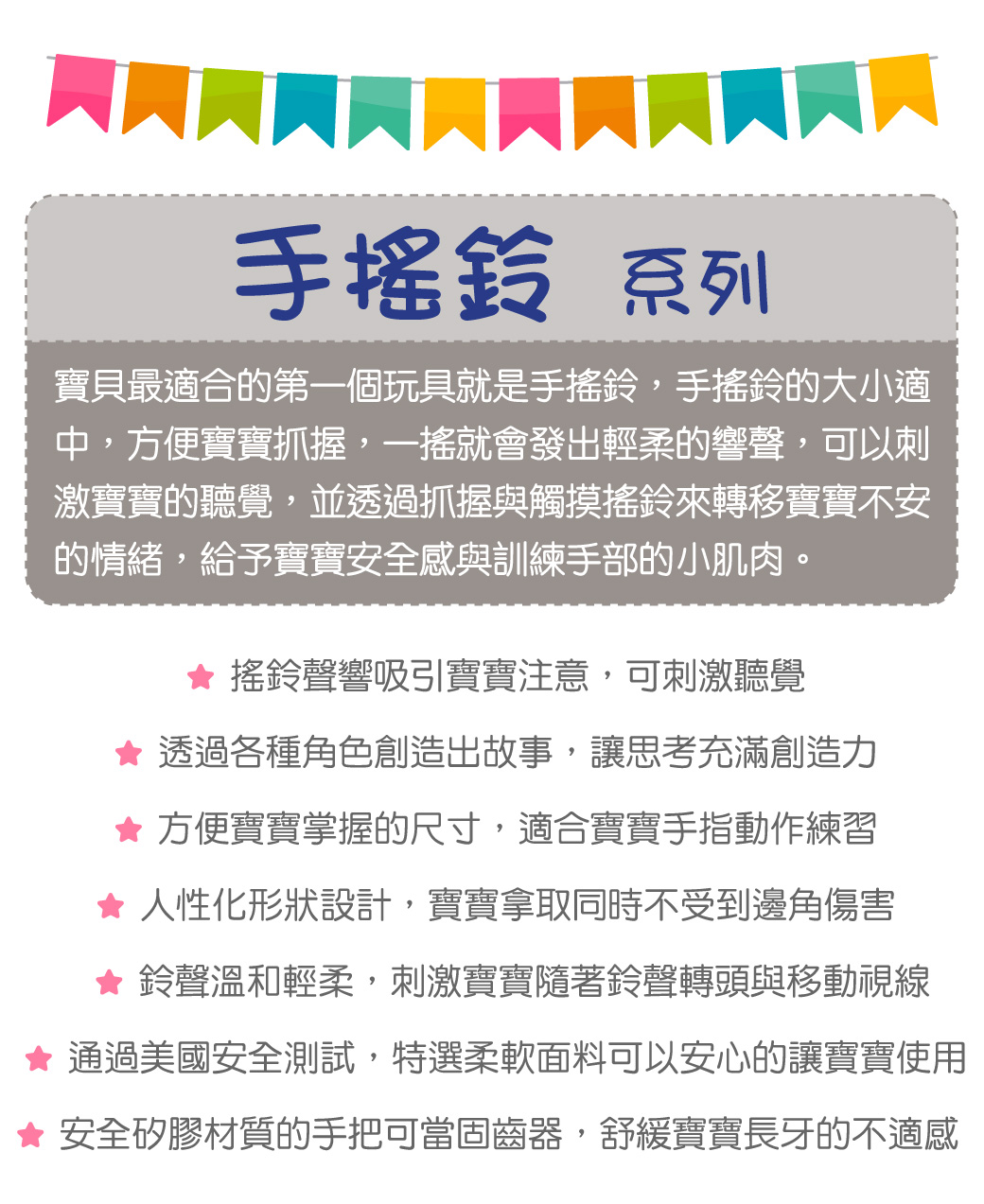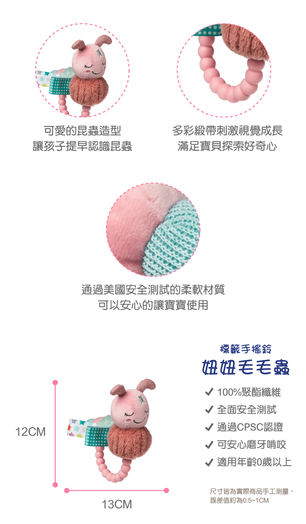 妞妞毛毛蟲身上每一節顏色,是收集森林裡的好夢祝福。她最喜歡做的事就是幫助小寶寶安心入睡●頭頂上有可愛的觸角和不同顏色的身體,帶來豐富的觸感刺激●探索標籤提供寶寶觸感的刺激●適合小手的尺寸易抓握,讓寶寶輕鬆訓練小手的肌肉●商品聲響設計,能刺激寶寶聽覺發展,同時促進手指靈活度練習●矽膠材質的手把可當固齒器,有效滿足寶寶口慾期需求,並舒緩口腔不適