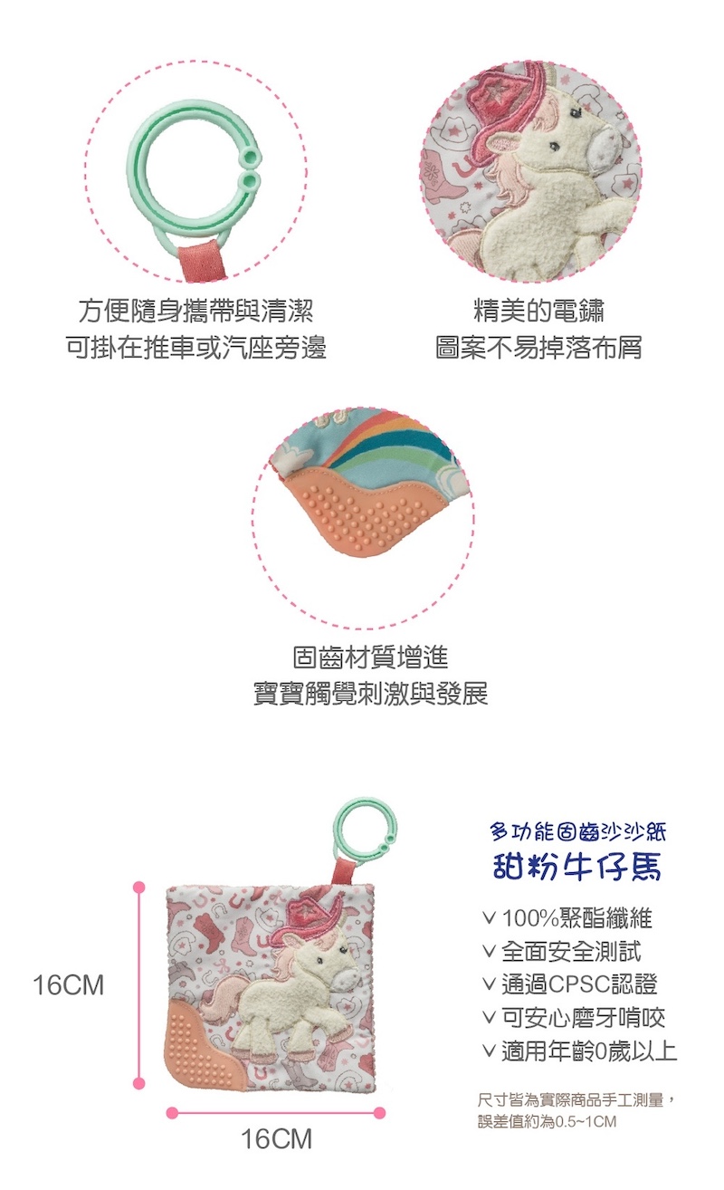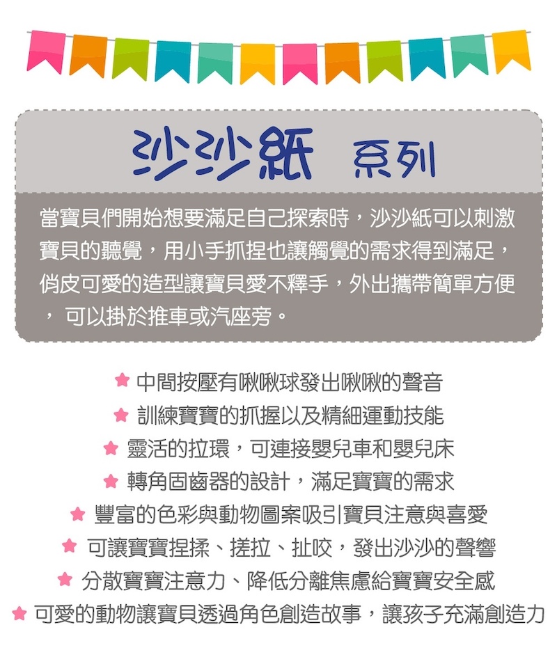 ●沙沙紙上靈活的拉環,可連接嬰兒車和嬰兒床