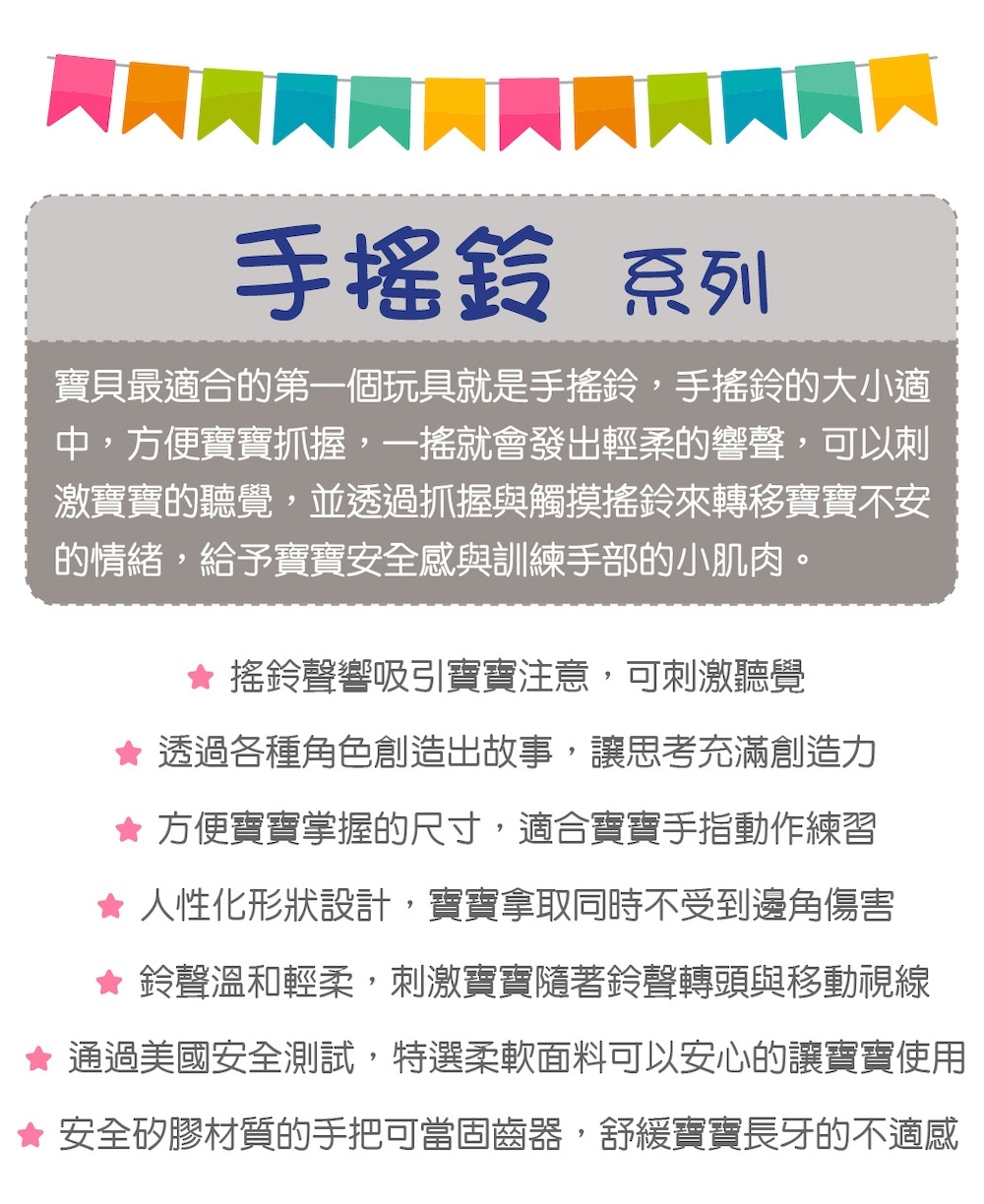 ●商品聲響設計能刺激聽覺發展,且小尺寸易於抓握,練習寶寶手指靈活度