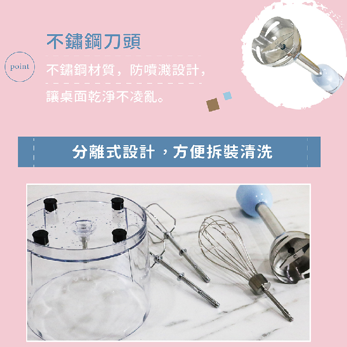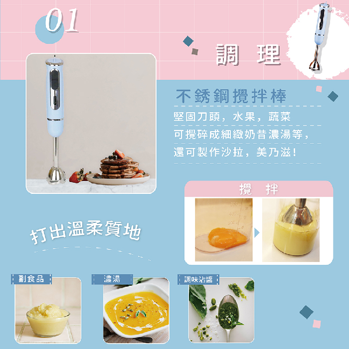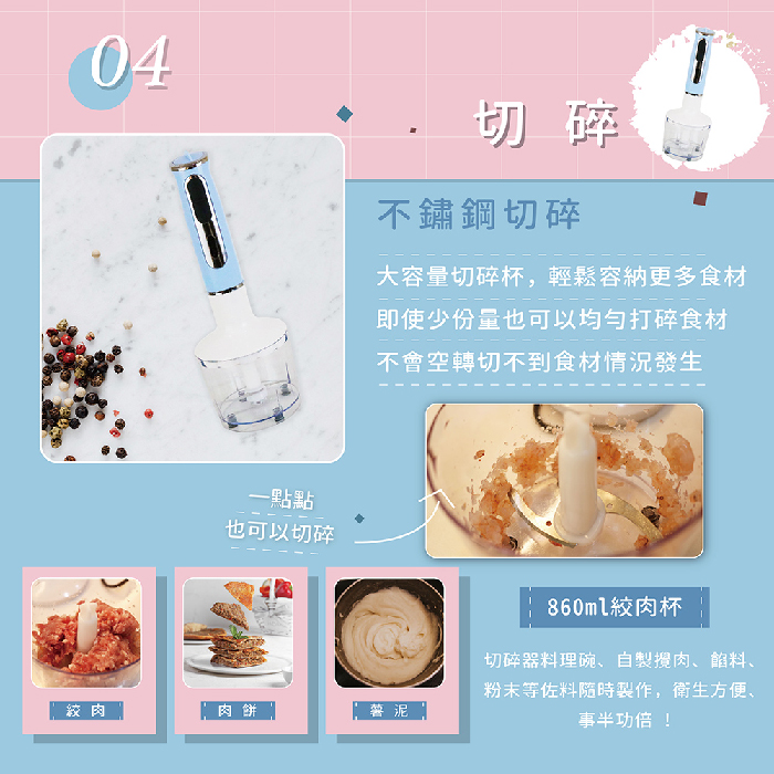|高品質安心購買|源自於日本的 MAXCELIA ,是日本松木與義大利設計師共同創立的品牌,品牌的意寓來自於 cèlia ~ 是拉丁文天堂的意思,台灣瑪莎團隊集結了台灣小家電的菁英,將 MAXCELIA 產品在當地深根,改良設計符合台灣消費者使用習慣,更在品質上導入日本經驗使產品更完整且精緻,研發團隊對於產品設計的堅持及鑽研,多項專利的研發,只為了台灣消費者的健康與家居便利。◆304不鏽鋼材質,讓您安心使用◆DC直流攪拌馬達,攪拌零死角◆人體工學握把設計,料理更輕鬆◆可拆式配件,清潔更便利◆ T U R B O 轉速,快速調理◆ 八段調速,調理隨心所欲◆ 低噪音值約< 80dB,調理不擾人<br>◆ 窈窕造型,烘焙調理完美幫手◆果汁杯可調理又可收納商品名稱:變速窈窕棒五貼心全配組商品型號:MX-0240AHM 包裝尺寸:155*98*249mm包裝重量:0.89kg本體尺寸:63*63*370mm本體重量:單支 0.69kg 單支+所有配件 1.36kg內容物:主機、調理杯1000ml、絞肉杯860ml、不鏽鋼刀片、攪麵器、不鏽鋼絞肉刀片、打蛋器#食材 #美食 #輕鬆 #調理 #調理器具 #攪拌機 #攪拌棒 #料理機 #攪拌#調理機 #輕鬆煮 #在家煮最安心 #安心煮 #家電 #家電 #食物調理機#安心 #自己煮 #家庭 #器具 #餐點 #備料 #切菜器 #副食品 #食材攪拌機 #果汁機#甜點 #奶油 #快速打發