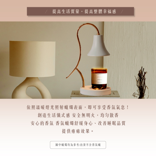 - 柔和燈光設計,不僅溫暖融化蠟燭,更為您的空間增添一抹溫馨浪漫的氣氛。