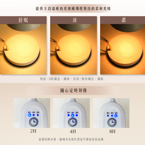 - 三段定時功能,自由設定融蠟時間,享受香氛的同時,節能又安心,使用更便利。