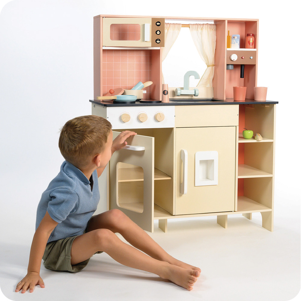 豪華多功能廚房組(奶茶色),提供孩子準備食材和烹飪的完美廚房。假日用烤箱烤蛋糕和餅乾,再用煎鍋準備早餐。砂鍋裡正在燉菜,加入調味料後,再用木湯匙均勻攪拌。將新鮮蔬菜放進冰箱,再將杯子放到製冰機下裝冰塊。使用微波爐加熱食物,再按下需微波的時間。休息時間,讓咖啡機為你沖泡一杯香濃的濃縮咖啡。洗手台設有對外窗,提供小廚師與客人交談,傳遞美食的美好。開放式的遊戲,讓孩子透過家家酒遊戲,盡情發揮想像力和創造力,並發展社交和語言能力。