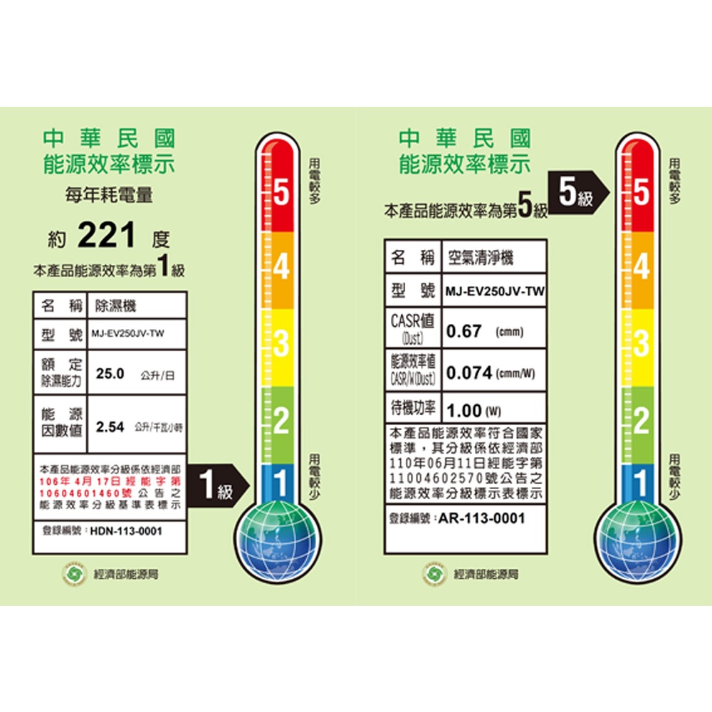 商品特色:智慧變頻三重除濕系統四重防護濾網衣物乾燥多種貼心功能100°廣角自動擺葉內抗菌.外清淨底部滑輪定時開關機兒童安全鎖商品規格:型號:MJ-EV250JV-TW顏色:白色系適用坪數:約16-32坪除濕公升數:25L電源:110V/60Hz噪音比(dB):42 / 34 dB尺寸(寬x高x深):410 x 650 x 285 mm重量:18.9kg濾網種類:四重防護濾網水箱容量:5.5L連續排水:可接排水管馬達型式:變頻除濕方式:三重除濕系統能源效率等級:除濕第一級、空氣清淨第五級適用室溫範圍:5~40℃產地:日本保固:3年BSMI:R32174貨源:公司貨本商品資訊由網路及官網收集彙整而成,僅供參考,如有更新或異動不另外通知,正確商品資訊及規格以實機為準。鑑賞期非試用期,產品一經拆箱、插電及使用皆會影響您退貨權利。