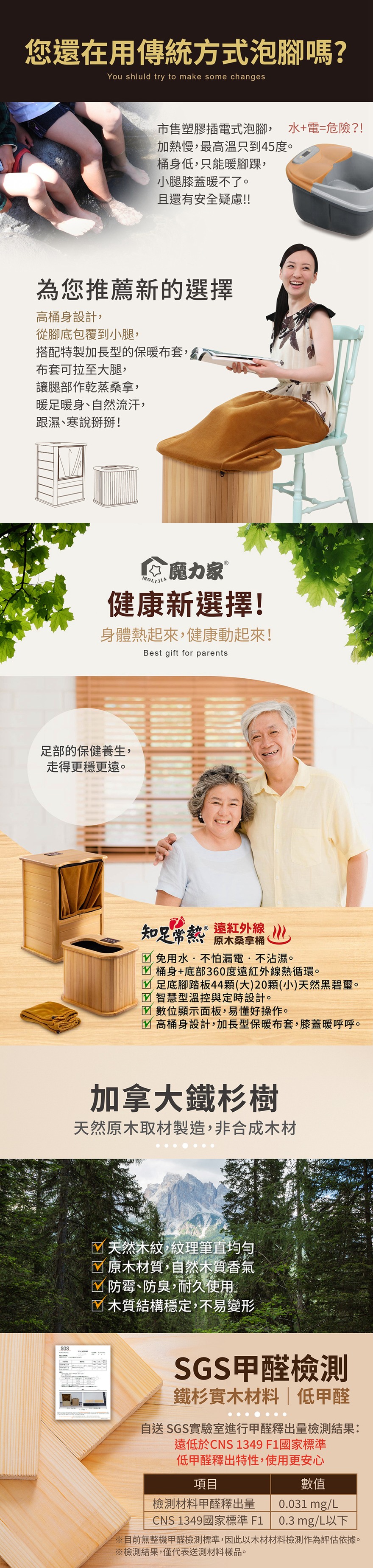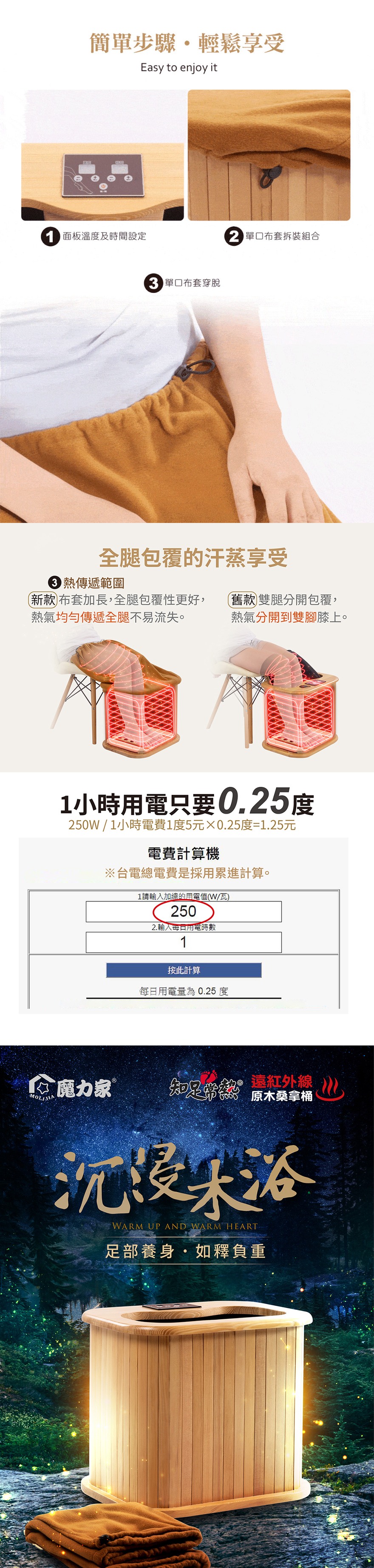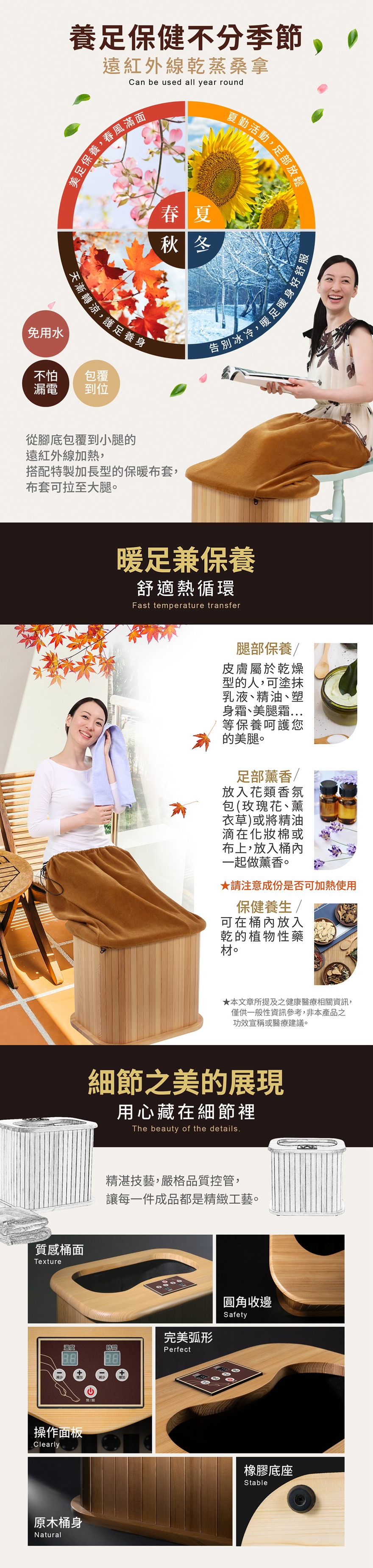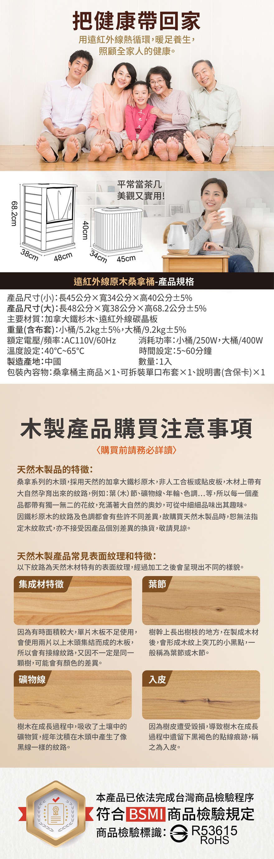 產品名稱:【MOLIJIA 魔力家】知足常熱-遠紅外線原木桑拿桶-輕巧版小型顏色:原木產品尺寸:桶身:長45cm x 寬34cm x 高40cm ±5%可拆裝加長型布套:長59cm x 寬69cm±5%電源線:250cm±5%整機重量:5.2 Kg±5% (含可拆裝加長型布套)主要材質:加拿大鐵杉木+遠紅外線碳晶板使用電壓:AC 110V /60HZ消耗功率:250W商檢字號:R53615製造產地:中國 (台灣設計)包裝內容物:桑拿桶主商品x1 +可拆裝單口布套x1+說明書(含保卡)x1※ 於購買日期(或製造日期)起算保固內,非人為不當使用的新品故障瑕疵維修,由本公司派車【免費到府收送】維修,所產生的費用由本公司全額負擔。(限台灣本島內收送)※ 產品在正常使用範圍內,享有自購買日期(或製造日期)起算24個月內,產品零件免費維修更換的保固服務。符合有下列所述時,請勿使用或是在專業醫師指導下使用:1、孕婦。2、使用中有胸悶、呼吸不順或其他不適症狀時,請立即停止使用。3、飯後30分鐘內。4、重傷初癒或剛開完刀,身體尚未復元。※ 請保持產品本體的乾燥,請勿在浴室或潮濕處使用;本產品請勿使用在頭部和傷口處。※ 鑑賞期內如需退換貨,商品本身、贈品、包裝彩盒均務必保持完整齊 。