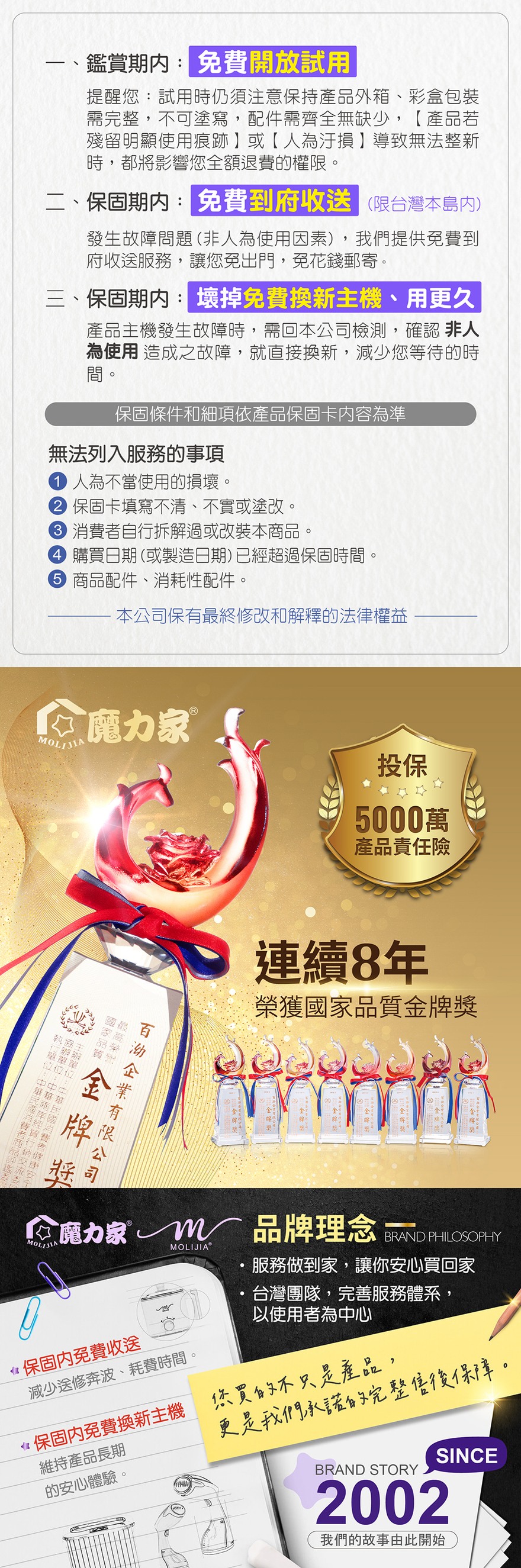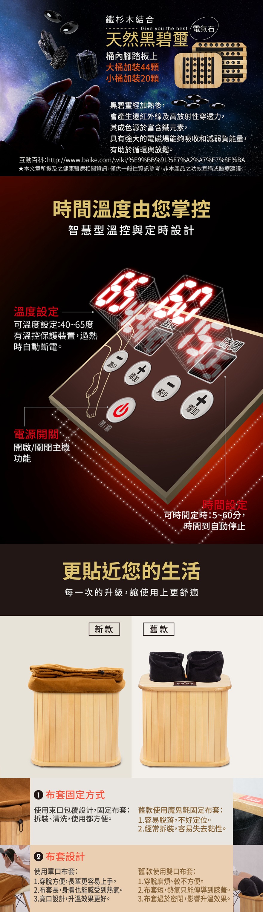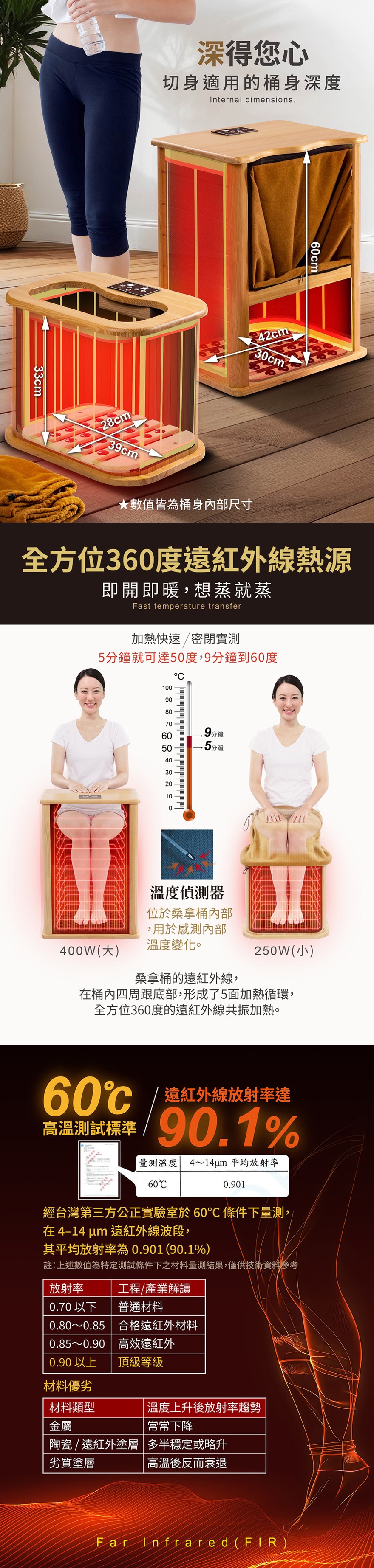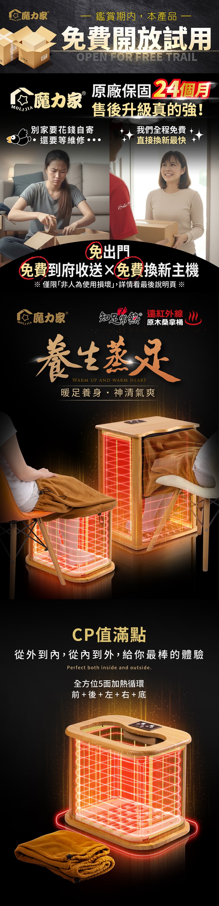 產品名稱:【MOLIJIA 魔力家】知足常熱-遠紅外線原木桑拿桶-輕巧版小型顏色:原木產品尺寸:桶身:長45cm x 寬34cm x 高40cm ±5%可拆裝加長型布套:長59cm x 寬69cm±5%電源線:250cm±5%整機重量:5.2 Kg±5% (含可拆裝加長型布套)主要材質:加拿大鐵杉木+遠紅外線碳晶板使用電壓:AC 110V /60HZ消耗功率:250W商檢字號:R53615製造產地:中國 (台灣設計)包裝內容物:桑拿桶主商品x1 +可拆裝單口布套x1+說明書(含保卡)x1※ 於購買日期(或製造日期)起算保固內,非人為不當使用的新品故障瑕疵維修,由本公司派車【免費到府收送】維修,所產生的費用由本公司全額負擔。(限台灣本島內收送)※ 產品在正常使用範圍內,享有自購買日期(或製造日期)起算24個月內,產品零件免費維修更換的保固服務。符合有下列所述時,請勿使用或是在專業醫師指導下使用:1、孕婦。2、使用中有胸悶、呼吸不順或其他不適症狀時,請立即停止使用。3、飯後30分鐘內。4、重傷初癒或剛開完刀,身體尚未復元。※ 請保持產品本體的乾燥,請勿在浴室或潮濕處使用;本產品請勿使用在頭部和傷口處。※ 鑑賞期內如需退換貨,商品本身、贈品、包裝彩盒均務必保持完整齊 。