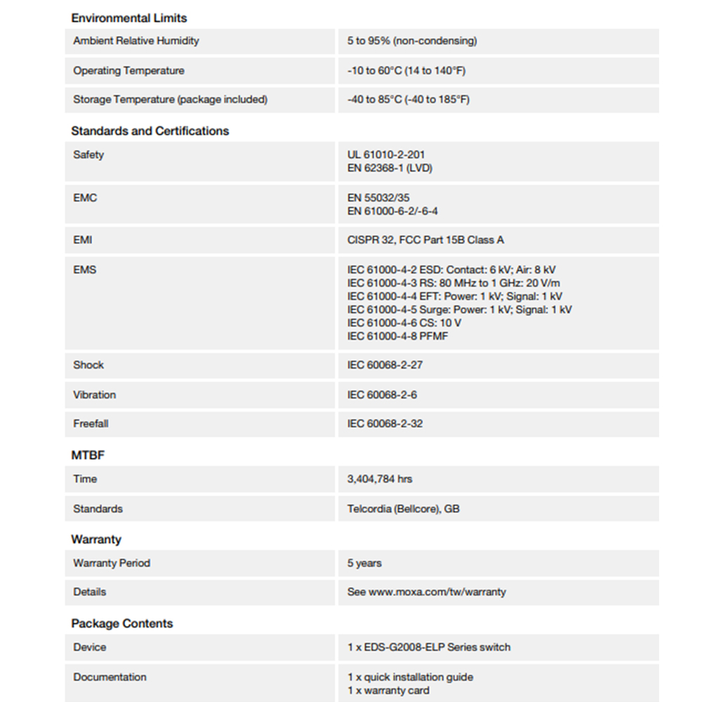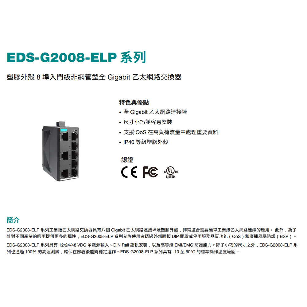 EDS-G2008-ELP系列具有12/24/48 VDC單電源輸入、DIN Rail鋁軌安裝,以及高等級EMI/EMC防護能力。除了小巧的尺寸之外,EDS-G2008-ELP系列也通過 100%的高溫測試,確保在部署後能夠穩定運作。EDS-G2008-ELP系列具有-10至60°C的標準操作溫度範圍。