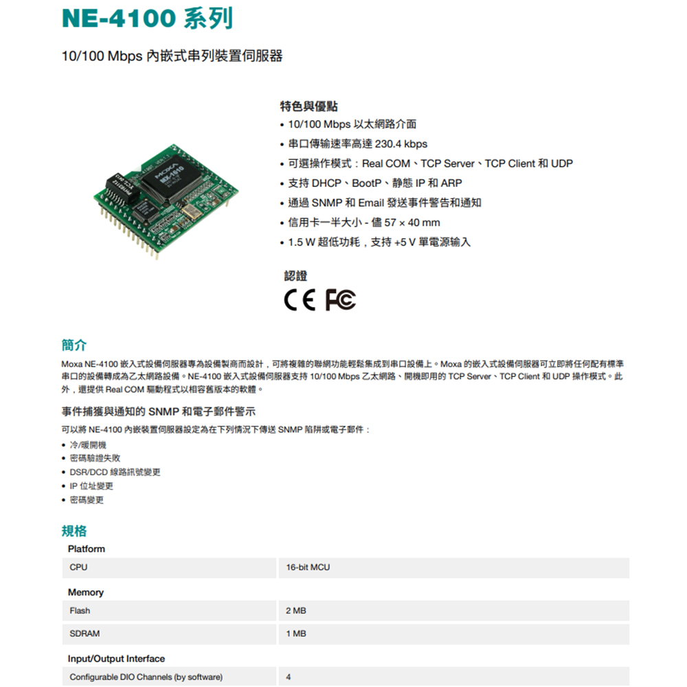 昌運監視器 MOXA NE-4100T 10/100 Mbps內嵌式串列裝置伺服器 26針雙列直插式 TTL訊號