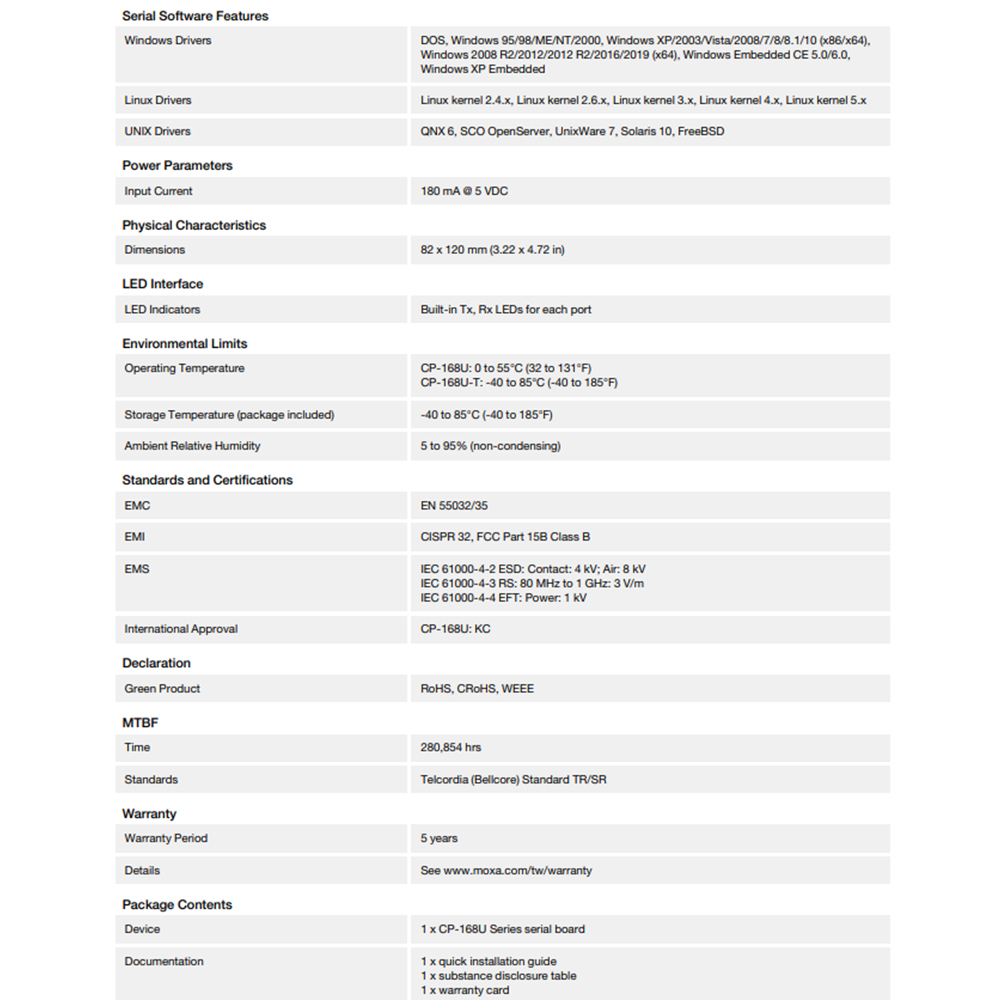 CP-168U是一款智慧型8埠 Universal PCI擴充卡,專為POS和ATM應用所設計。它是工業自動化工程師和系統整合商的頂級選擇,並且可支援許多不同的作業系統,包括Windows、Linux甚至是UNIX。此外,每個擴充卡的八個RS-232串列擴充卡可支援快速921.6 kbps傳輸率。CP-168U可提供完整數據機控制訊號以確保與廣泛串列週邊設備的相容性,同時可與3.3 V和5 V PCI匯流排搭配使用,使得擴充卡幾乎可以安裝於任何可用的PC伺服器。