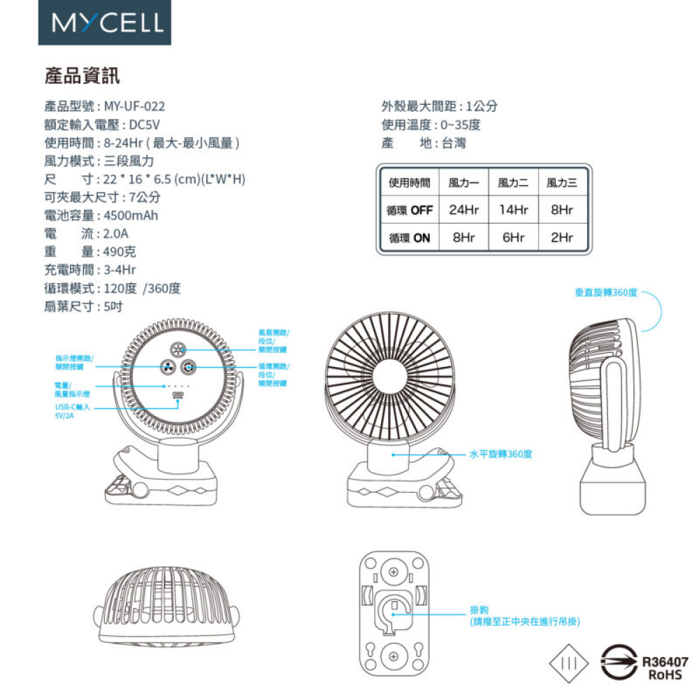 ● 靈活3D擺頭,增加空氣對流循環● 使用時間8~24小時● 勾夾立吊,適用各種情境● 二段LED燈,晚上也看的見〈商品規格〉產品型號:MY-UF-022產品淨量:490g(含電池)產品尺寸:220×1160×65mm輸 入:DC5V/2.0A輸 出:3.76W充電時間:3~4H充電方式:USB充電持續使用時間:8~24H(最大-最小風量)循環模式:120度/360度內 容 物:主機、充電線產 地:台灣