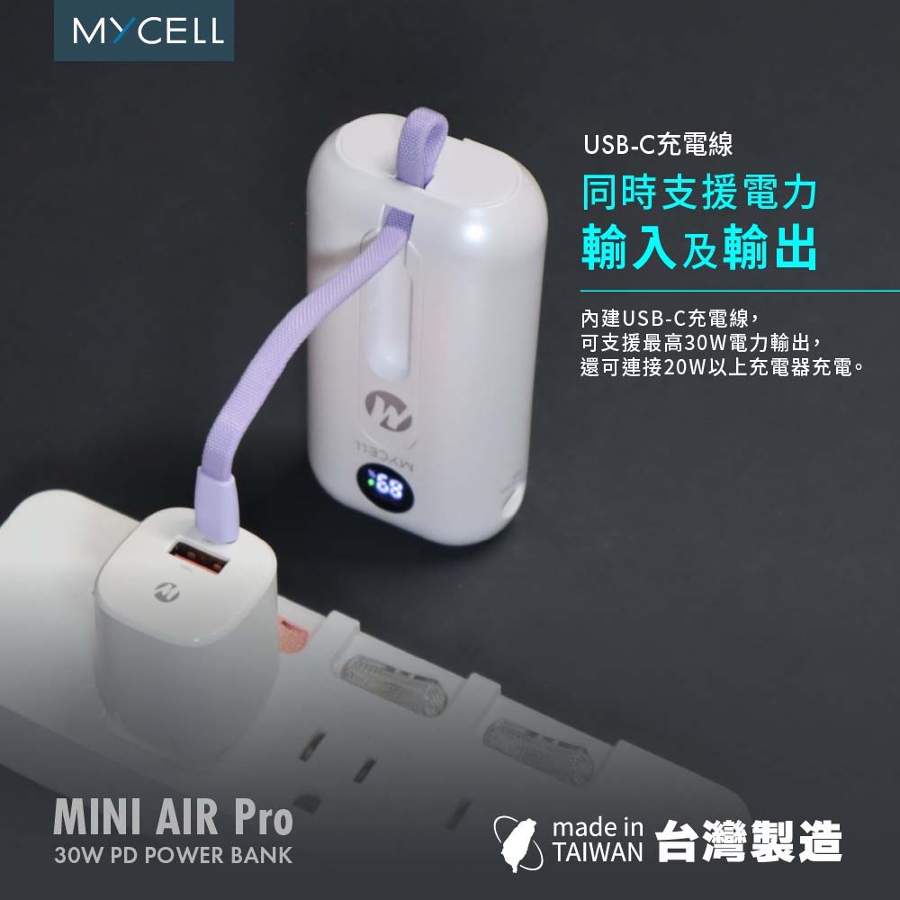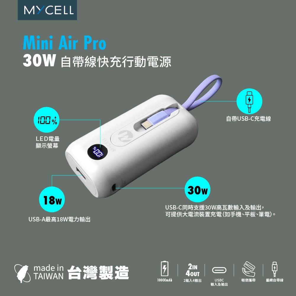 【sansuijibau】Mini Air Pro PD30W Power Bank with Built-in Dual-Wire Fast Charging, 10000mAh, Made in Taiwan (MIT), Explosion-proof Battery Cells, White