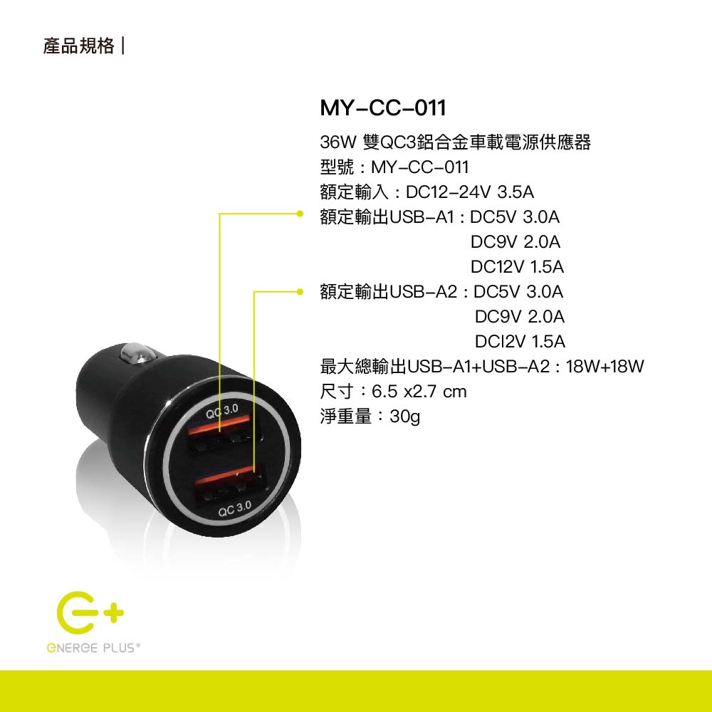• 適用車型:大多數主流車型【商品規格】•額定輸入 : DC12-24V 3.5A•額定輸出USB-A1 :DC5V 3A/DC9V 2A/DC12V 1.5A•額定輸出USB-A2 :DC5V 3A/DC9V 2A/DC12V 1.5A•額定最大總輸出 : 36W•重量 : 30g•尺寸 : 6.5 x 2.7cm