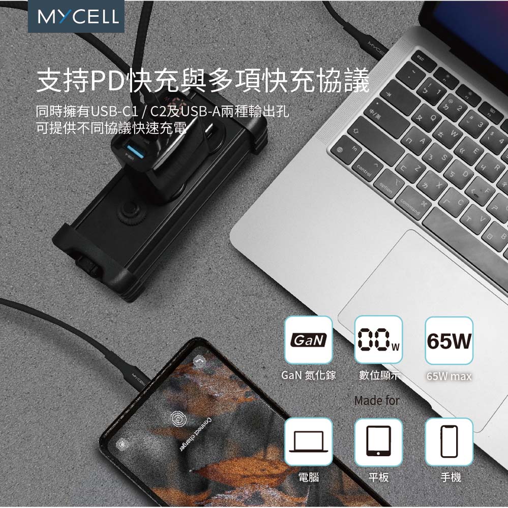 ・市面最快雙USB-C同時快充技術,電腦+手機同時充電,65W Max