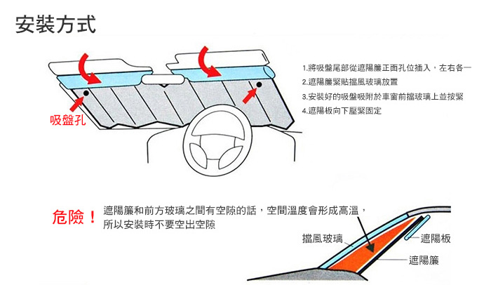 .設計中央的U型缺口,能避開前擋風玻璃的後視鏡。.利用吸盤,輕易安裝在前方擋風玻璃上。.不使用時可以把體積縮到最小,折疊放置非常方便。.氣泡加厚完全隔熱。.有效降低車內溫度,耐熱耐用不變形。.使用彈性束帶,收納更方便。