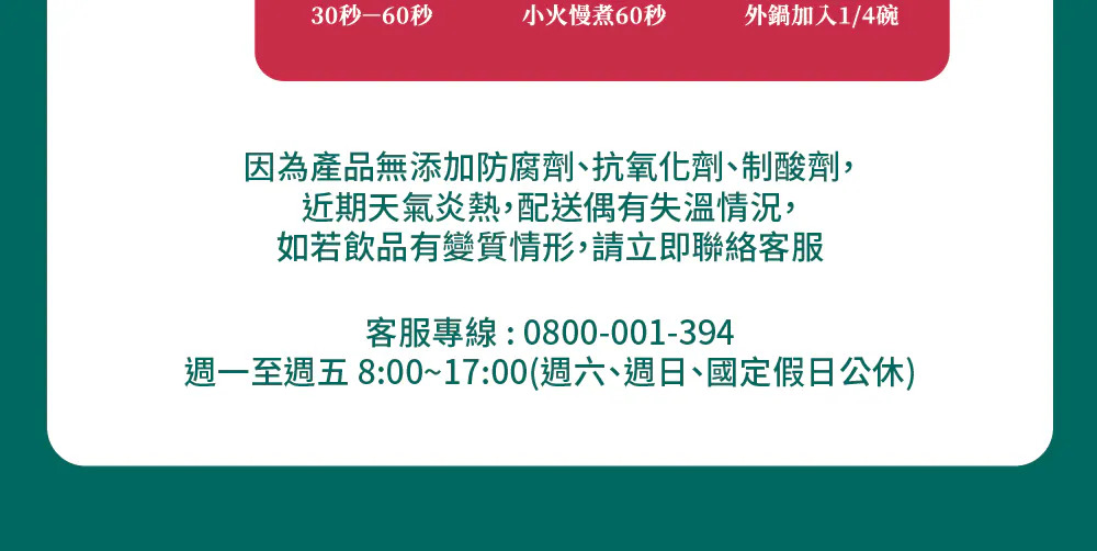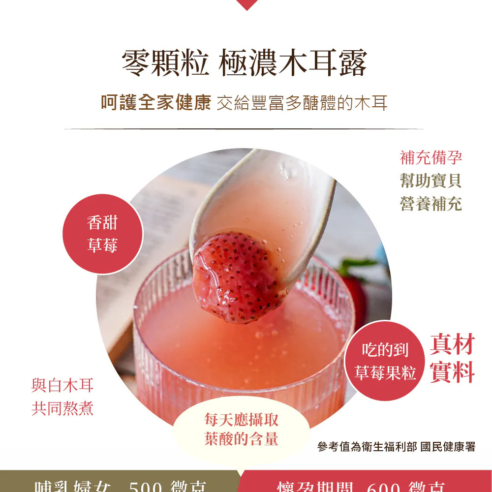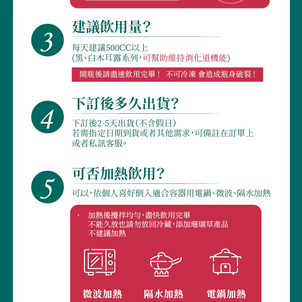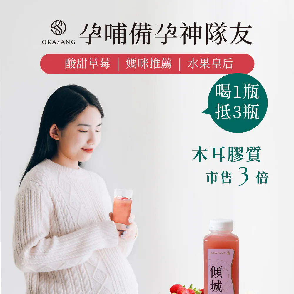 🎖️產地溯源,高架新鮮草莓直送,30顆草莓精華熬煮!🎖可補充攝取膳食纖維,幫助維持消化道機能🎖新鮮草莓,營養補給 | 孕媽媽神隊友🎖零顆粒木耳露❓常見Q&A❓Q1.孕婦可以喝嗎?A1.白木耳系列整個孕期都非常適合,黑木耳系列建議4個月以上可以定期飲用Q2.保存時間多久?如何保存?A2.全新製成,未開封冷藏保存期限約30日左右,以瓶身後面保存期限為主,因飲品皆為無添加,開瓶後建議一週內飲用完畢。‼️請注意不可冷凍避免造成瓶身破裂‼️Q3.可否加熱飲用?A3.可以,可依照個人喜好倒入適合的容器中,用電鍋、微波、隔水加熱皆可加熱後攪拌均勻盡快飲用完畢,不能久放也請勿放回冷藏(若有添加珊瑚草產品則不建議加熱)🍵加熱建議🍵微波加熱:30-60秒隔水加熱:小火慢煮60秒電鍋加熱:外鍋加入1/4碗水Q4.建議飲用量?A4.建議每日500c.c.以上,黑、白木耳可協助維持消化道機能!*因產品皆為無添加防腐劑、抗氧化劑、制酸劑,若有遇飲品配達有失溫或者變質情形請立即聯絡客服回收及後續服務☎️客服專線:0800-001-394🗒️LINE:@okasang🤵♀️客服服務時間:一、二 8:30-17:00三、四 、五 8:30-21:00六、日 10:00-21:00