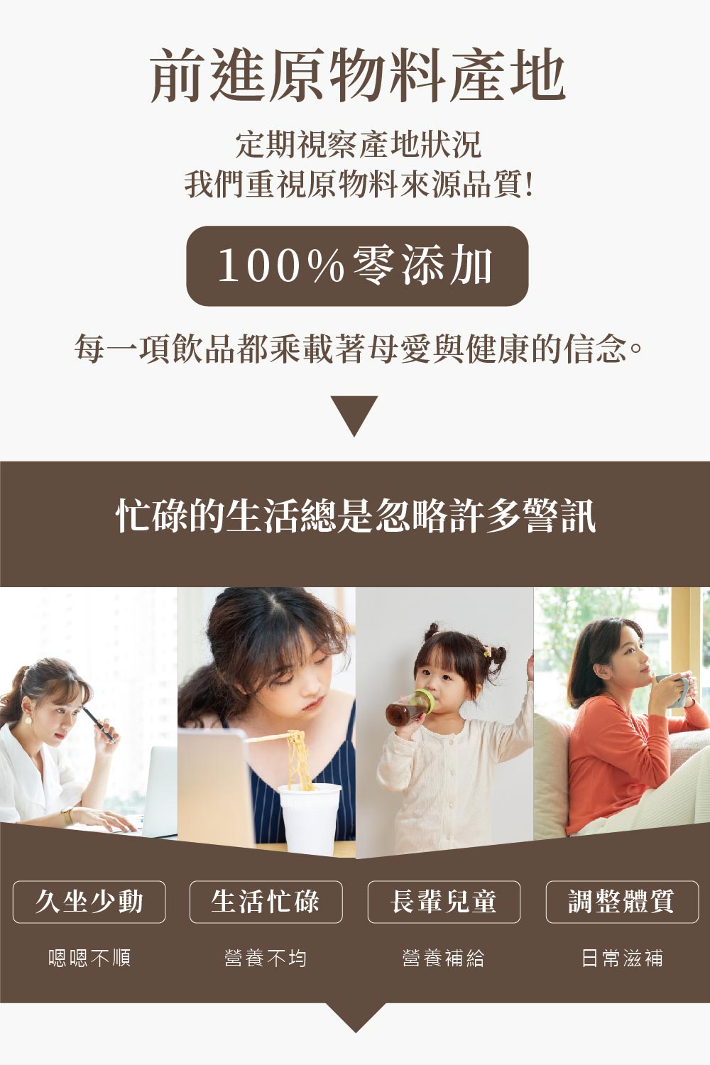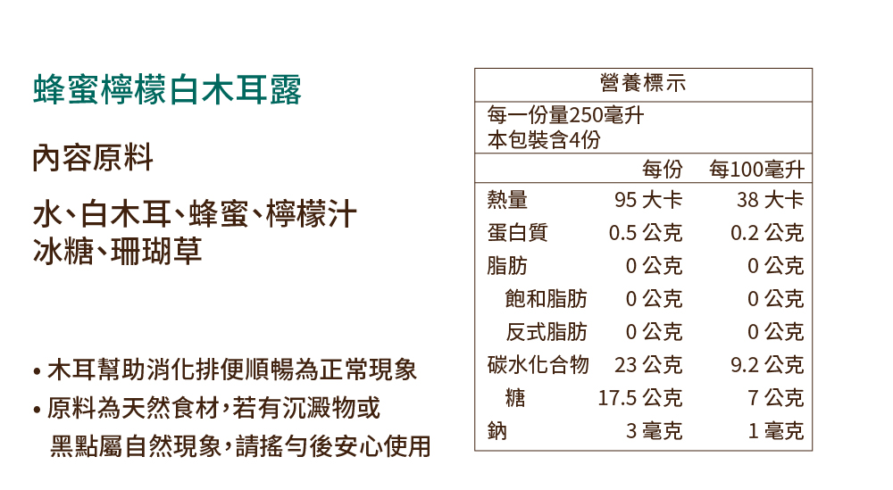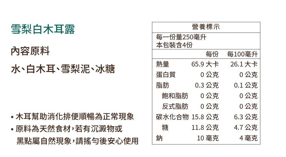 -草莓白木耳露- 每一份量250毫升,本包裝含4份 -每份- 熱量:97大卡 蛋白質:0.3公克 脂肪:0.1公克 飽和脂肪:0公克 反式脂肪:0公克 碳水化合物:24公克 糖:12.7公克 鈉:62毫克 -每100毫升- 熱量:39大卡 蛋白質:0.1公克 脂肪:0公克 飽和脂肪:0公克 反式脂肪:0公克 碳水化合物:9.6公克 糖:5.1公克 鈉:25毫克 -雪梨白木耳露- 每一份量250毫升,本包裝含4份 -每份- 熱量:65.9大卡 蛋白質:0公克 脂肪:0.3公克 飽和脂肪:0公克 反式脂肪:0公克 碳水化合物:15.8公克 糖:11.8公克 鈉:10毫克 -每100毫升- 熱量:26.1大卡 蛋白質:0公克 脂肪:0.1公克 飽和脂肪:0公克 反式脂肪:0公克 碳水化合物:6.3公克 糖:4.7公克 鈉:4毫克 -蜂蜜檸檬白木耳露- 每一份量250毫升,本包裝含4份 -每份- 熱量:95大卡 蛋白質:0.5公克 脂肪:0公克 飽和脂肪:0公克 反式脂肪:0公克 碳水化合物:23公克 糖:17.5公克 鈉:3毫克 -每100毫升- 熱量:38大卡 蛋白質:0.2公克 脂肪:0公克 飽和脂肪:0公克 反式脂肪:0公克 碳水化合物:9.2公克 糖:7公克 鈉:1毫克