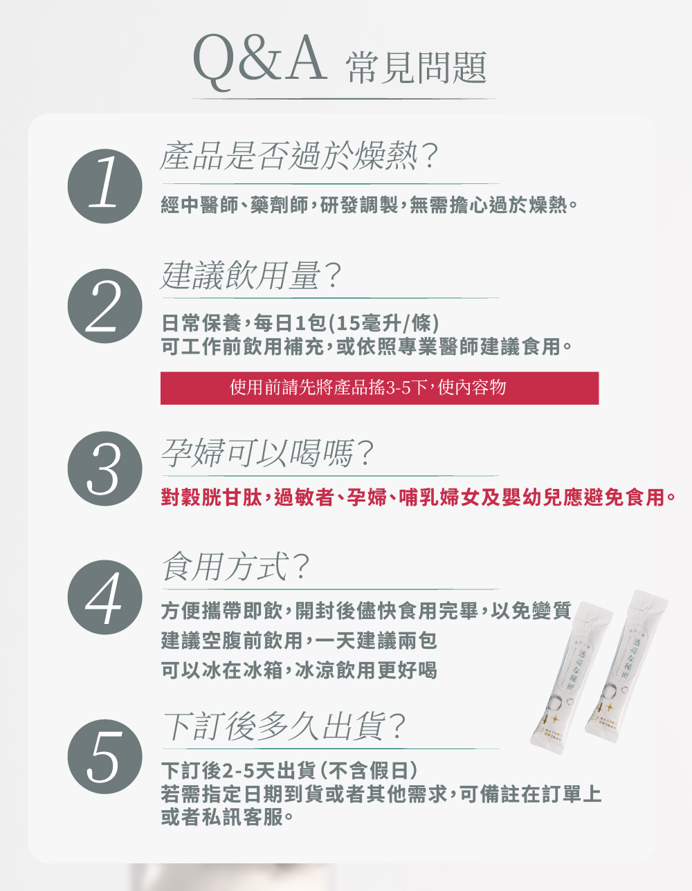 A2.日常保養每日1包,可工作前飲用補充,或依照專業醫師建議食用。