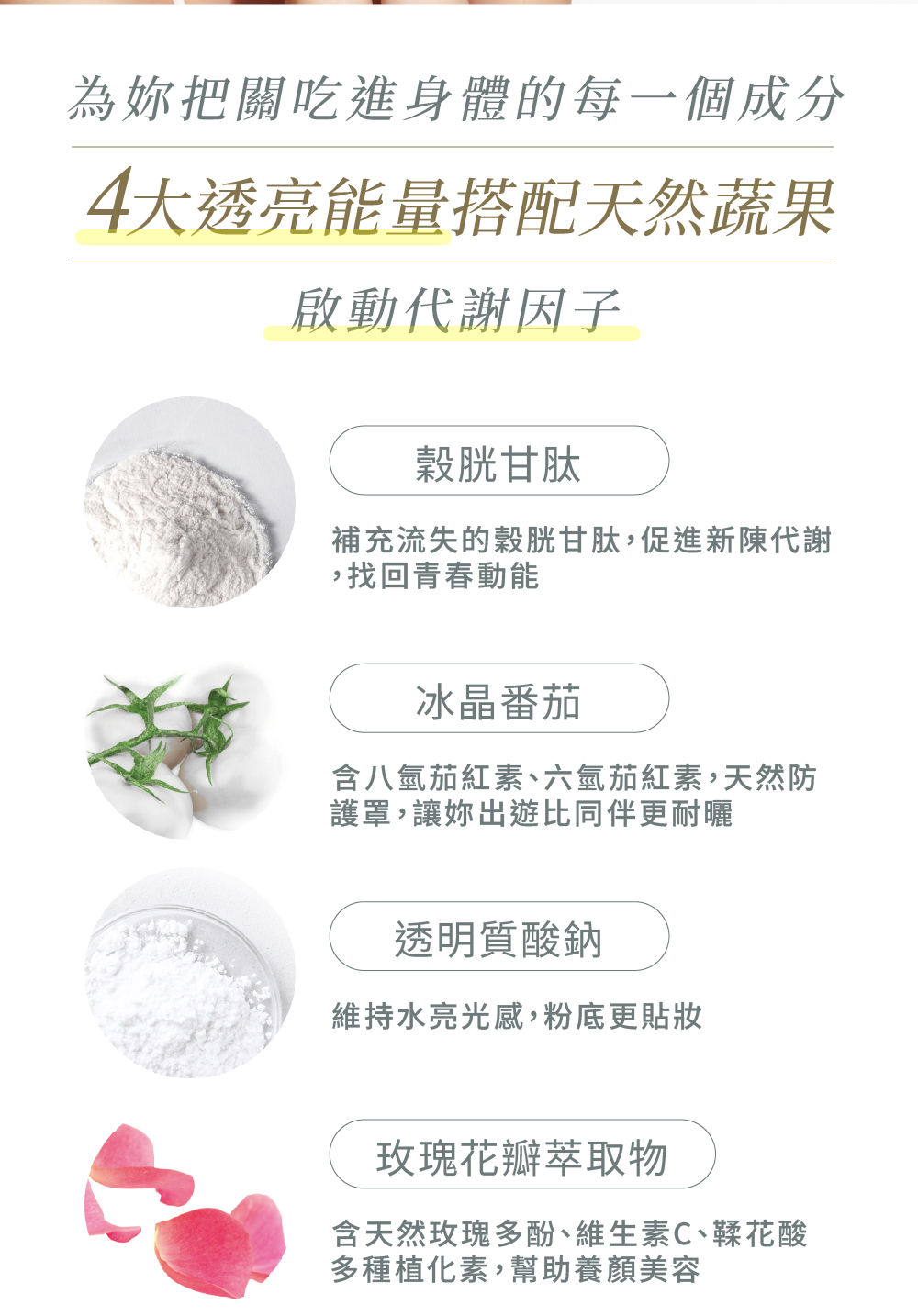 4大透亮食材冰晶蕃茄、玫瑰花、鏈球菌發酵物、穀胱甘肽