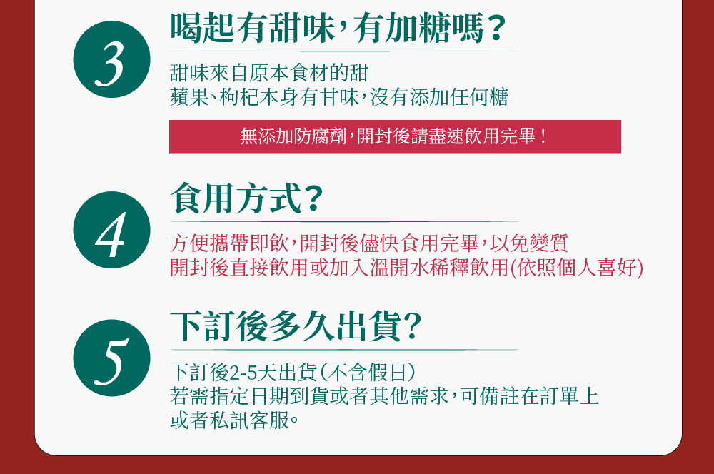 A3.甜味來自於原本食材的甜,蘋果、枸杞本身有甘味,沒有添加任何糖
