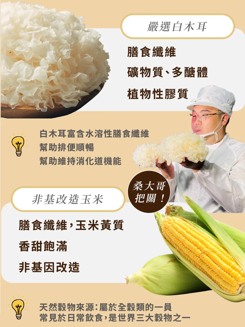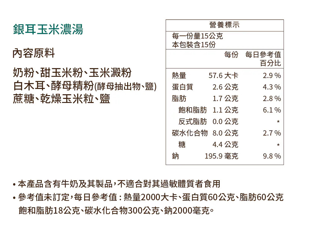 奶粉、甜玉米粉、玉米澱粉、白木耳、酵母精粉(酵母抽出物、鹽)、蔗糖、乾燥玉米粒、鹽