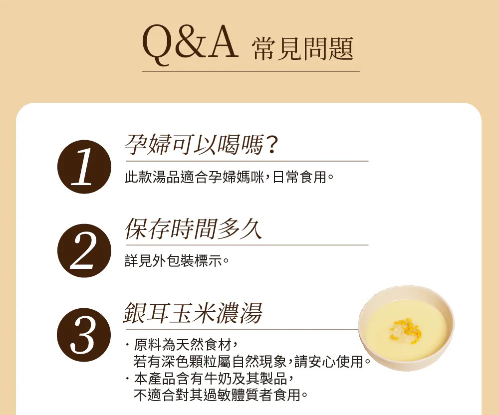 這包真的不一樣,絕無添加化學添加物❌增稠劑❌抗凝結劑❌香精🏅頂級紐西蘭乳源,乳香濃郁🏅嚴選銀耳配方,幫助維持消化道機能🏅嚴選非基改玉米🏅無添加抗結塊劑,100%零添加,給家人最安心的喝護堅持100%零添加理念,經過多方測試研發出絕無添加的,銀耳玉米濃湯不用吃進化學添加物,烹煮給家人喝也是最安心。【沖泡粉包,一鍋健康湯品即刻上桌 !】