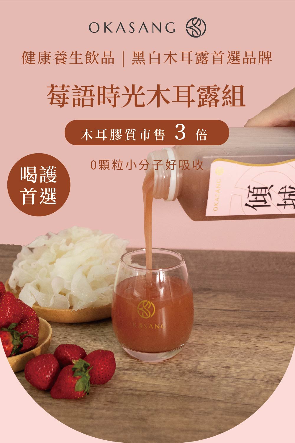 🎖️產地溯源,高架新鮮草莓直送,30顆草莓精華熬煮!🎖可補充攝取膳食纖維,幫助維持消化道機能🎖新鮮草莓,營養補給 | 孕媽媽神隊友🎖零顆粒木耳露❓常見Q&A❓Q1.孕婦可以喝嗎?A1.白木耳系列整個孕期都非常適合,黑木耳系列建議4個月以上可以定期飲用Q2.保存時間多久?如何保存?A2.全新製成,未開封冷藏保存期限約30日左右,以瓶身後面保存期限為主,因飲品皆為無添加,開瓶後建議一週內飲用完畢。‼️請注意不可冷凍避免造成瓶身破裂‼️Q3.可否加熱飲用?A3.可以,可依照個人喜好倒入適合的容器中,用電鍋、微波、隔水加熱皆可加熱後攪拌均勻盡快飲用完畢,不能久放也請勿放回冷藏(若有添加珊瑚草產品則不建議加熱)🍵加熱建議🍵微波加熱:30-60秒隔水加熱:小火慢煮60秒電鍋加熱:外鍋加入1/4碗水Q4.建議飲用量?A4.建議每日500c.c.以上,黑、白木耳可協助維持消化道機能!*因產品皆為無添加防腐劑、抗氧化劑、制酸劑,若有遇飲品配達有失溫或者變質情形請立即聯絡客服回收及後續服務☎️客服專線:0800-001-394🗒️LINE:@okasang🤵♀️客服服務時間:一、二 8:30-17:00三、四 、五 8:30-21:00六、日 10:00-21:00
