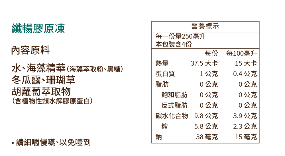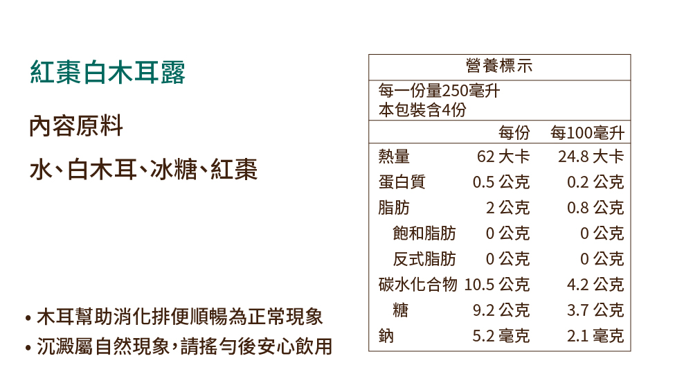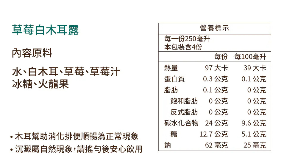-草莓白木耳露- 每一份量250毫升,本包裝含4份 -每份- 熱量:97大卡 蛋白質:0.3公克 脂肪:0.1公克 飽和脂肪:0公克 反式脂肪:0公克 碳水化合物:24公克 糖:12.7公克 鈉:62毫克 -每100毫升- 熱量:39大卡 蛋白質:0.1公克 脂肪:0公克 飽和脂肪:0公克 反式脂肪:0公克 碳水化合物:9.6公克 糖:5.1公克 鈉:25毫克 -纖暢膠原凍- 每一份量250毫升,本包裝含4份 -每份- 熱量:37.5大卡 蛋白質:1公克 脂肪:0公克 飽和脂肪:0公克 反式脂肪:0公克 碳水化合物:9.8公克 糖:5.8公克 鈉:38毫克 -每100毫升- 熱量:15大卡 蛋白質:0.4公克 脂肪:0公克 飽和脂肪:0公克 反式脂肪:0公克 碳水化合物:3.9公克 糖:2.3公克 鈉:15毫克 -紅棗白木耳露(銀耳朵朵)- 每一份量250毫升,本包裝含4份 -每份- 熱量:62大卡 蛋白質:0.5公克 脂肪:2公克 飽和脂肪:0公克 反式脂肪:0公克 碳水化合物:10.5公克 糖:9.2公克 鈉:5.2毫克 -每100毫升- 熱量:24.8大卡 蛋白質:0.2公克 脂肪:0.8公克 飽和脂肪:0公克 反式脂肪:0公克 碳水化合物:4.2公克 糖:3.7公克 鈉:2.1毫克
