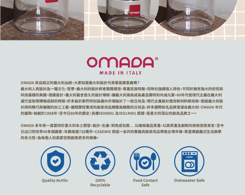 型號:S2033品名:罐子材質:PP-PE-ACRYLIC尺寸:11*H15CM容量:1L包裝數/盒:1注意事項:可供食品接觸用途使用年限:無限產地:義大利無塑化劑、無雙酚A、不含重金屬、不含有害物質、可重複使用、低污染