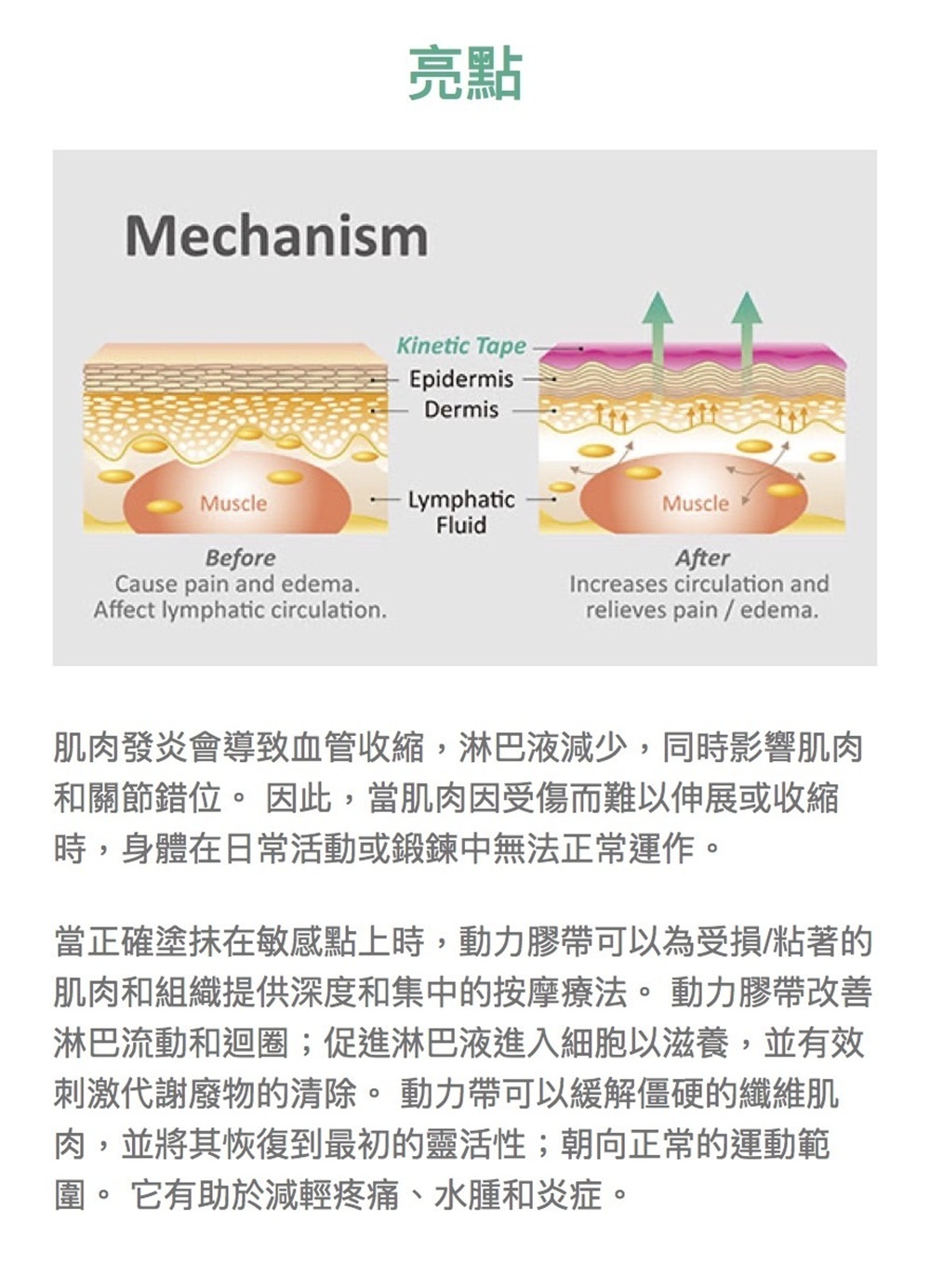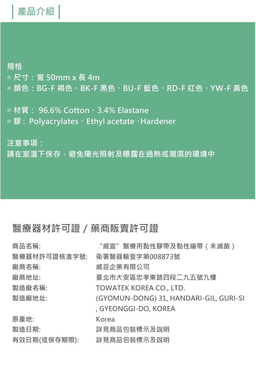 ◆ 注意事項1.請遵照醫師、防護員或專業人員指導使用。2.使用前請先清潔皮膚,不適用毛髮長與外傷者,以避免感染。3.太過乾燥的皮膚會增加過敏或不適感的發生,而潮濕的皮膚則會使黏著力降低。4.避免延伸貼布超過原來長度的140%,可能會因此降低其功能與增加過敏的機率。5.當使用在較為敏感的部位時(例如:腹部、腿部、手部內側或小孩及年長者的皮膚)應避免拉扯貼布。6.黏膠遇熱會增加黏性,在熱敷或接觸熱水後,須注意因黏度增加而可能產生的過敏現象。7.為確保貼布效用請定時更換,如產生過敏或搔癢不適,請立即停止使用;未使用完的貼布,請收捲好後置於盒中及陰涼處存放。8.不要直接使用在流血傷口處及已擦拭、塗抹任何有藥性或無藥性之皮膚上。9.特殊病症、請遵醫囑。使用後如有不適,請即停止使用並就醫治療。1、商品組合/規格:歐活醫療用黏性膠帶及黏性繃帶(未滅菌)2、醫療器材許可證◆核定品名:飛力軀幹裝具 (未滅菌) ◆核准字號:衛署醫器製壹字第005216號◆藥商名稱:歐柏醫療器材有限公司◆製造廠名稱:彪仕醫技股份有限公司◆製造廠地址:台南市南區中華路一段23號3、藥商許可執照◆醫材許可執照字號:中市醫材販 字第 MD6203022382 號◆藥商名稱:佑全藥品股份有限公司◆藥商地址:台中市西屯區福和里台灣大道四段925號20樓之1◆諮詢專線電話:0800-046-111 / 0800-557-6884、製造日期:詳見商品包裝標示及說明5、有效期間或保存期限:詳見商品包裝標示及說明6、消費者使用前應詳閱醫療器材說明書