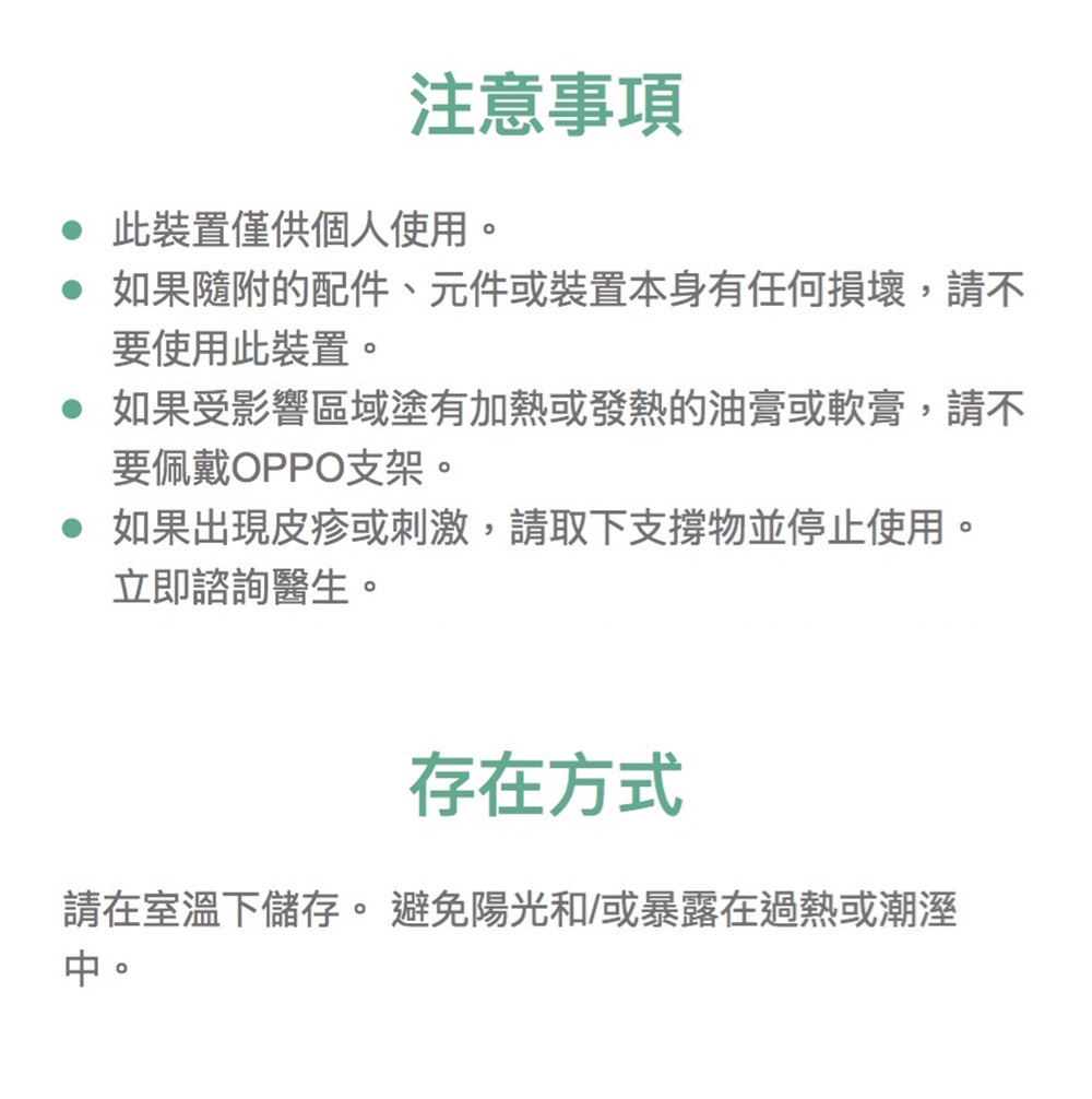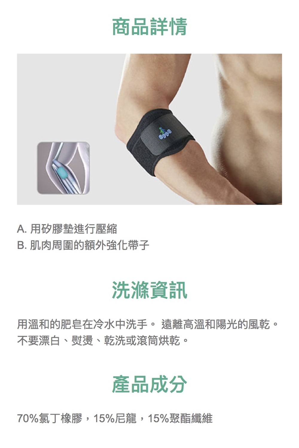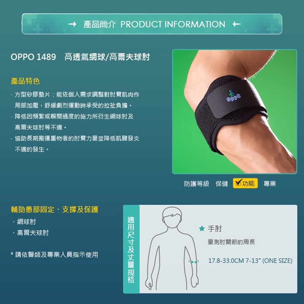 .方型矽膠墊片:能依個人需求調整對肘臂肌肉作局部加壓,舒緩劇烈運動時承受的拉扯負擔。 .降低因頻繁或瞬間過度的施力所衍生網球肘及高爾夫球肘等不適。 .協助長期搬運重物者的肘臂力量並降低肌腱發炎不適的發生。量測肘關節的周長單一尺寸:17.8 – 33.0cm1、商品組合/規格:OPPO.1489(黑)網球肘束套2、醫療器材許可證◆核定品名: "歐活"肢體裝具(未滅菌)◆核准字號:衛部醫器製壹登字第001595號◆藥商名稱:歐柏股份有限公司◆製造廠名稱:彪仕醫技股份有限公司二廠◆製造廠地址:台南市南區中華西路一段43號3、藥商許可執照◆醫材許可執照字號:中市醫材販 字第 MD6203022382 號◆藥商名稱:佑全藥品股份有限公司◆藥商地址:台中市西屯區福和里台灣大道四段925號20樓之1◆諮詢專線電話:0800-046-111 / 0800-557-6884、製造日期:詳見商品包裝標示及說明5、有效期間或保存期限:詳見商品包裝標示及說明6、消費者使用前應詳閱醫療器材說明書 ◆ 注意事項1.產品彈性壓力及功能隨穿戴時間及頻率遞減,為確保產品效用達最大發揮,建議定期更換。2.穿戴後如有不適,請即停止使用並就醫診療。3.清潔用中性洗劑沖洗後風乾,請勿日照、熱烘。4.購買前請先檢查產品有無瑕疵;個人貼身用品,弄髒、毀損或洗滌過後,恕無法更換。 消費者使用前應詳閱醫療器材說明書