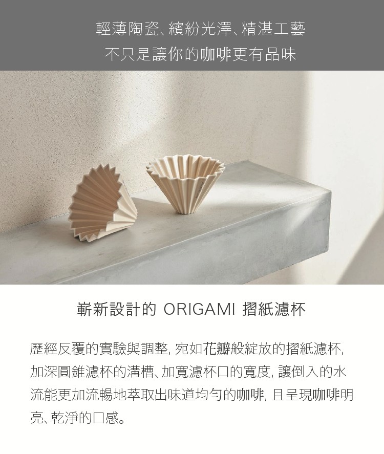 本商品為陶瓷濾杯+深色木質杯座的組合。不同於傳統常見的「扇形」濾杯,ORIGAMI 的特點是漂亮的「圓錐形」,底部一個大出水孔。瓷器的熱傳導率高,非常適合悶蒸,圓錐型構造讓咖啡粉在熱水中浸泡的時間拉長,咖啡粉膨脹,帶出咖啡中的濃郁芳香因子。「三分之二」是台灣總代理,敬請安心選購。*請留意螢幕可能有色差,請依收到實品為主
