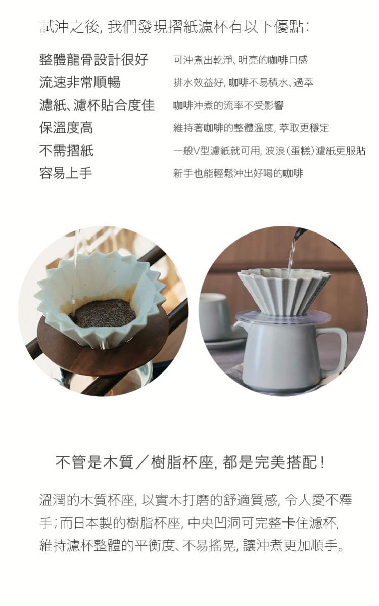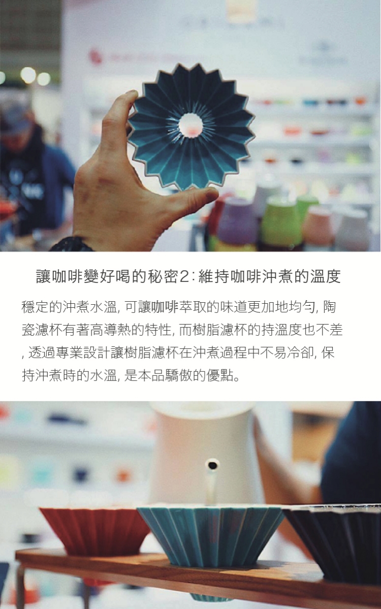 本商品為陶瓷濾杯+透明樹脂杯座的組合。不同於傳統常見的「扇形」濾杯,ORIGAMI 的特點是漂亮的「圓錐形」,底部一個大出水孔。瓷器的熱傳導率高,非常適合悶蒸,圓錐型構造讓咖啡粉在熱水中浸泡的時間拉長,咖啡粉膨脹,帶出咖啡中的濃郁芳香因子。「三分之二」是台灣總代理,敬請安心選購。