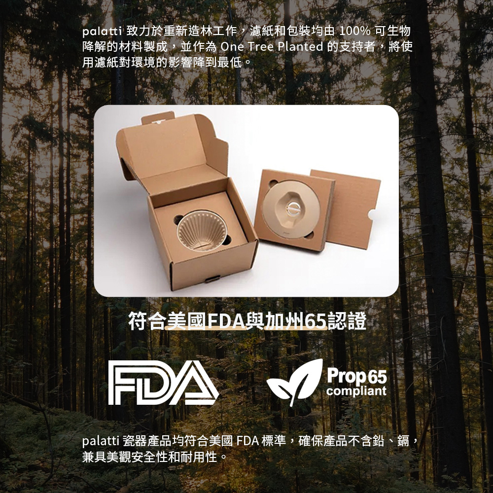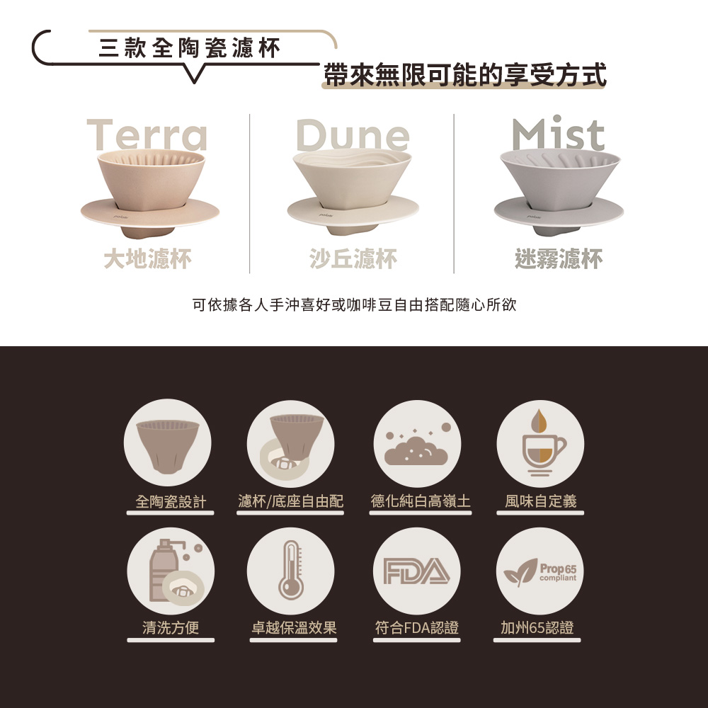 【palatti】Dune沙丘濾杯,採用德化瓷製成,在 1300°C 的高溫下燒製而成,不含鉛、不含鎘,可用洗碗機清洗,並符美國FDA 和 加州65提案的標準。平底有5個大孔和波浪肋條,波浪狀肋條設計,調節水流均勻萃取包覆粉層,確保每次都能均勻萃取、中等流量和均衡、細膩的口感,即使是新手也能輕鬆沖煮,享受風味飽滿的咖啡體驗,palatti咖啡濾杯為專利模組化設計,可互換其他款palatti濾杯及底座,進行多種不同沖煮變化。