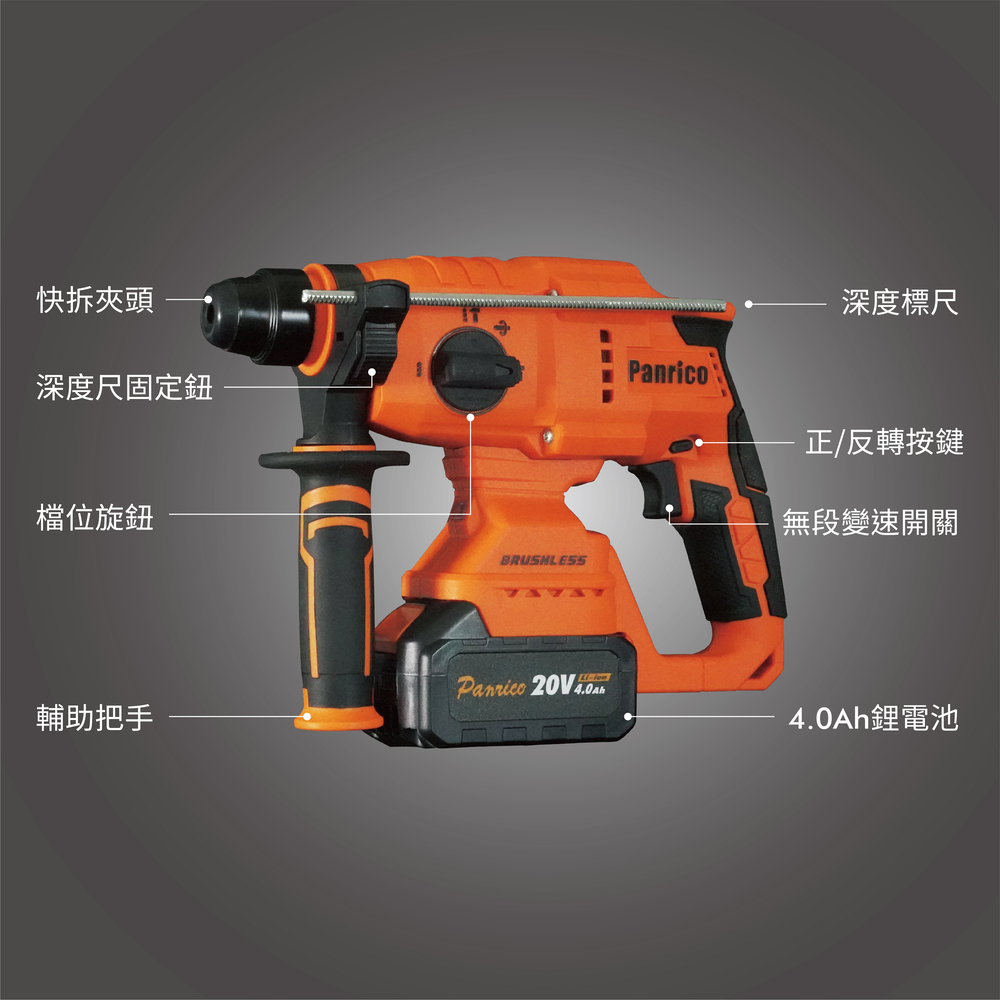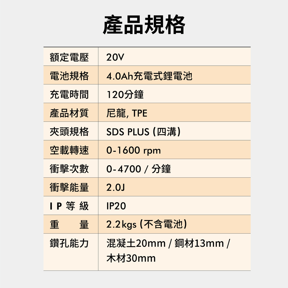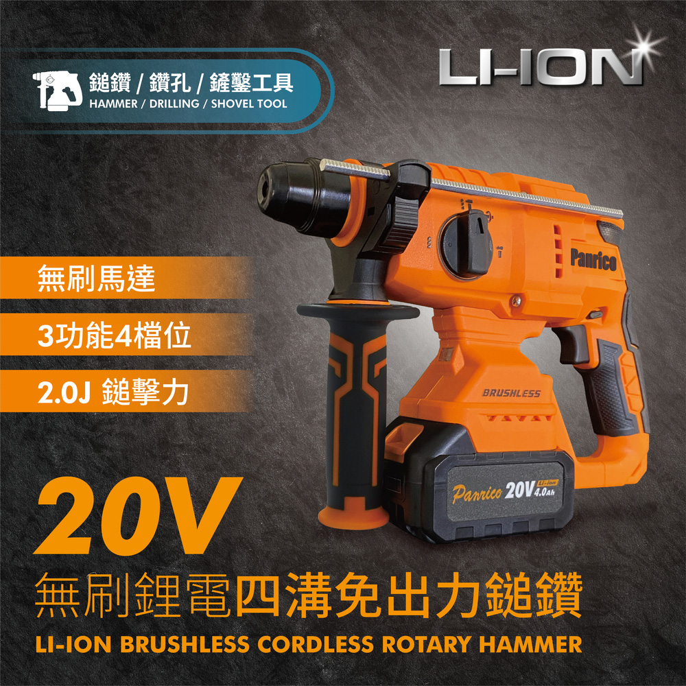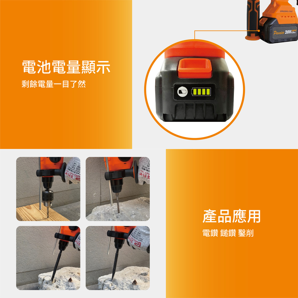 產品介紹 ● 20V四溝免出力鎚鑽,鑽孔、鎚鑽、鏟鑿三用功能 ● 無刷馬達,強勁高速鑽孔,使用壽命長 ● 2.0焦耳鎚擊力,有力的衝擊系統 ● 雙4.0Ah鋰電池,讓工作更有效率 ● 免出力設計,降低工作疲勞度 ● 10C重力型動力電池,瞬間出力大 ● 電池電量顯示,剩餘電量一目了然 ● 無段變速開關,操作更彈性 ● LED燈,輔助暗處施工照明 ● 鑽孔能力:混凝土20mm、鋼材13mm、木材30mm