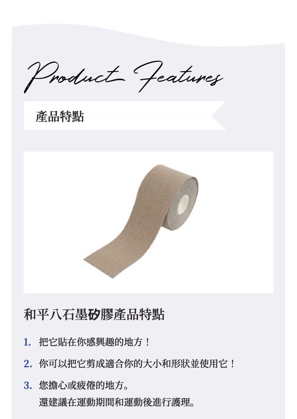 只需剪下並貼在您關心的部位減輕疲勞・預防寒冷!只需剪下並貼在您關心的部位。【推薦給這樣的人】●關心手指或手腕的人●感到僵硬或緊繃的人●關心腰部的人●關心膝蓋彎曲伸展的人●感到腿部沉重的人●運動時的護理●經常使用貼藥的人●身體某部分感到寒冷的人使用方法1. 請擦拭掉肌膚上的汗水和油脂。2. 將膠帶從盒子中拉出,然後根據需要貼的部位用剪刀剪下。3. 將膠帶從離型紙上撕下並貼上。● 使用後,撕下時可能會在肌膚上留下黑色的黏著劑。在這種情況下,請用濕毛巾輕輕擦拭或使用肥皂等清洗乾淨。※ 使用時,將角落剪掉可以減少過敏的發生。成分 ・ 原料棉、聚氨酯、黏合劑、石墨矽土注意事項・請根據以下的使用範例,正確地進行貼布。・不適合作為固定用膠帶。・黑色黏著部含有石墨矽土。1. 以下情況請勿使用:① 對黏著膠帶類有過敏或過敏症狀者② 骨折或韌帶損傷後不久③ 傷口④ 皮膚炎2. 使用中若出現皮疹、發紅、發癢等症狀,請立即停止使用並諮詢醫生。3. 請勿拉扯膠帶後再貼。4. 撕下膠帶時,請輕輕按住以避免拉起皮膚,並沿著毛髮的生長方向撕下。5. 為防止過敏:① 容易過敏的體質者,請先進行貼布測試後再使用。② 若感到癢,請立即撕下。③ 請勿連續貼在同一位置。④ 若不適合您的肌膚,請立即撕下。保管及使用相關注意事項1. 請保持產品在箱子內存放。2. 請存放在兒童無法觸及的地方。3. 請避免陽光直射及高溫,存放在乾燥涼爽的地方。■ 容量:50mm x 5m■ 原產國:日本