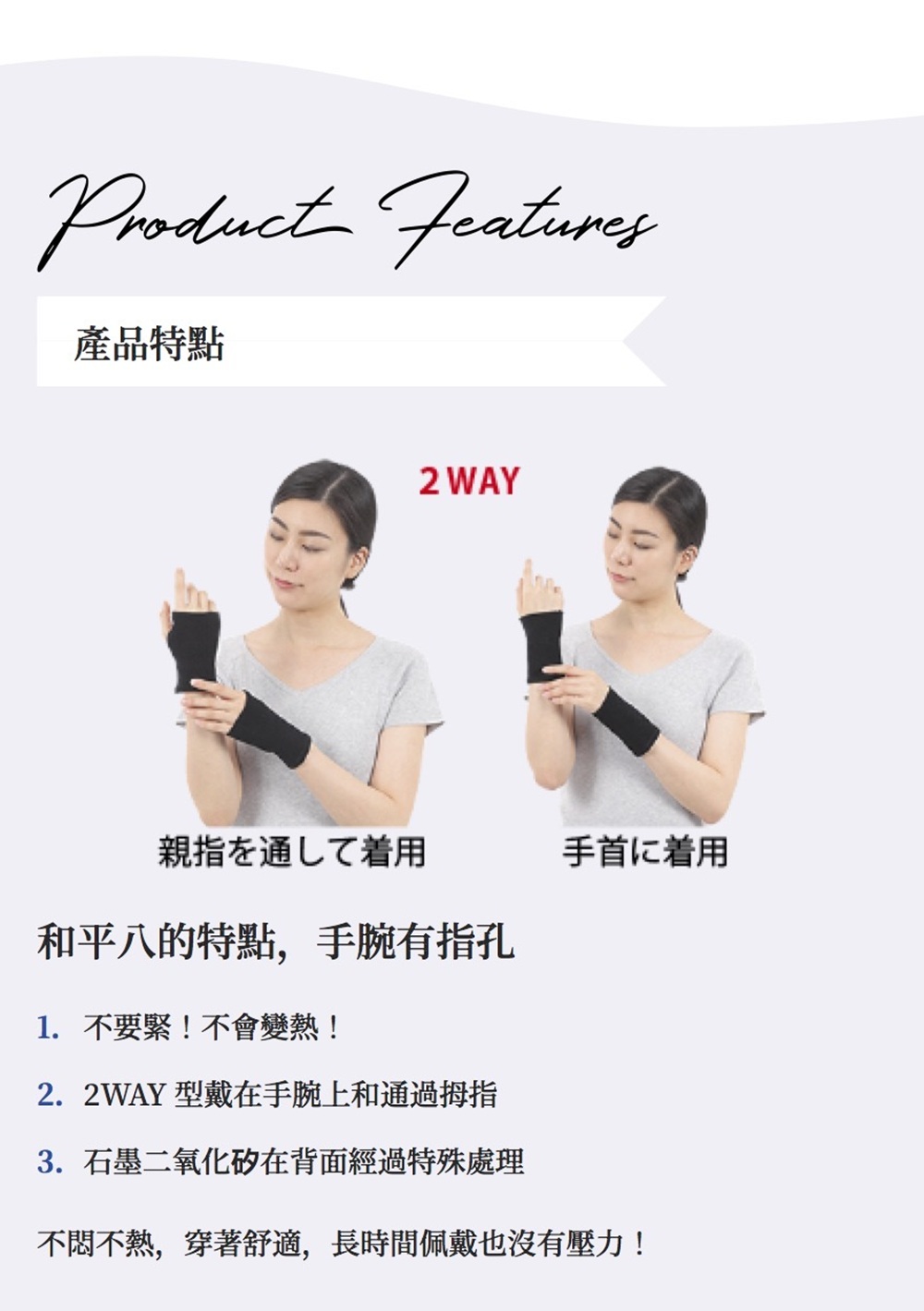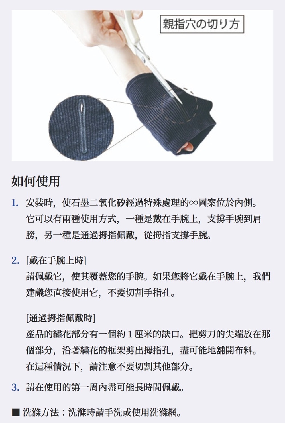 ・對於那些在使用電腦、智慧型手機或做家事時經常使用手腕的人:以無壓力的貼合方式支撐拇指、手腕和肩膀,不會收緊可戴在手腕上或穿過拇指的雙向型・沒擰緊!不會變熱!-背面經過特殊處理的石墨二氧化矽不會太熱或太悶,穿著舒適,因此您可以長時間佩戴而不會感到有壓力!使用方法・請連接石墨二氧化矽以進行專門處理。它可以用於戴手腕的方法上,以將手腕支撐在肩膀上,並用2個路支撐從拇指到拇指的手腕。[如果您將其戴在手腕上]・戴上它以牢固遮住手腕。如果您將其戴在手腕上,建議您使用它,而無需切割手指孔。[如果戴拇指戴]・產品的刺繡部分約有約1厘米。將剪刀的尖端放在那部分,並沿著繡花框架切開拇指孔,並儘可能散開織物。在這種情況下,請注意不要切開其他零件。請盡可能長的時間持續一周。■ 尺寸:腕圍:16cm-26cm■ 材質:人造絲、尼龍、聚氨酯、絲綢■ 產地:日本