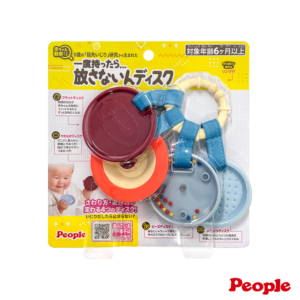 透過多種玩法&豐富觸感增添樂趣,非常適合作為練習手指靈活的入門玩具喔! 小圓盤可串在吊環上,外出攜帶便利!也可單獨拆下玩耍喔!