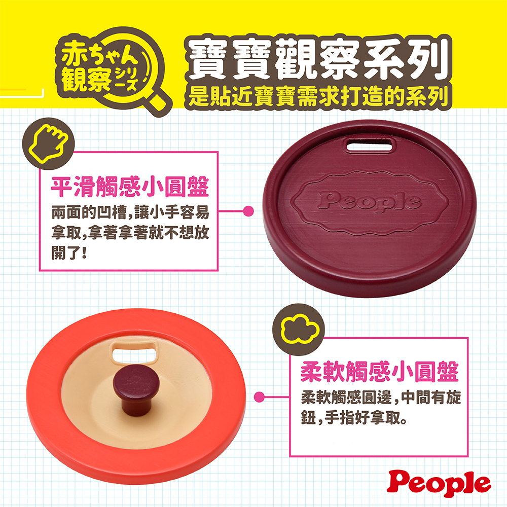 手指 平滑觸感小圓盤:兩面的凹槽,讓小手容易拿取,拿著拿著就不想放開了!