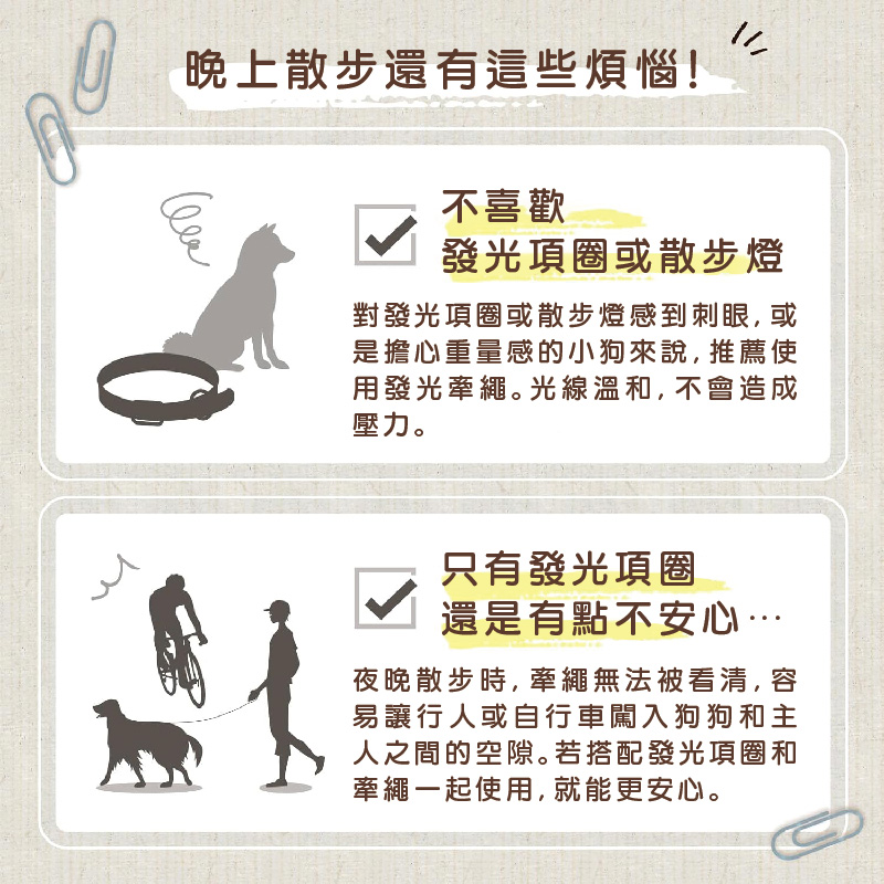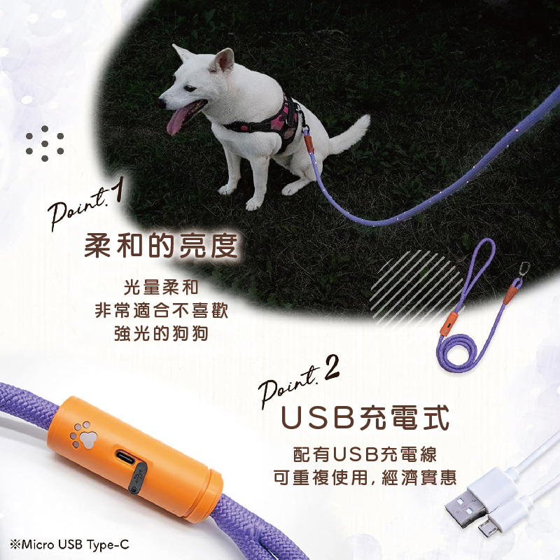 🐶 反光條設計更提升安全性除了 LED 光源外,牽繩本身反光條在車燈照射下也更顯眼,雙重防護更放心。