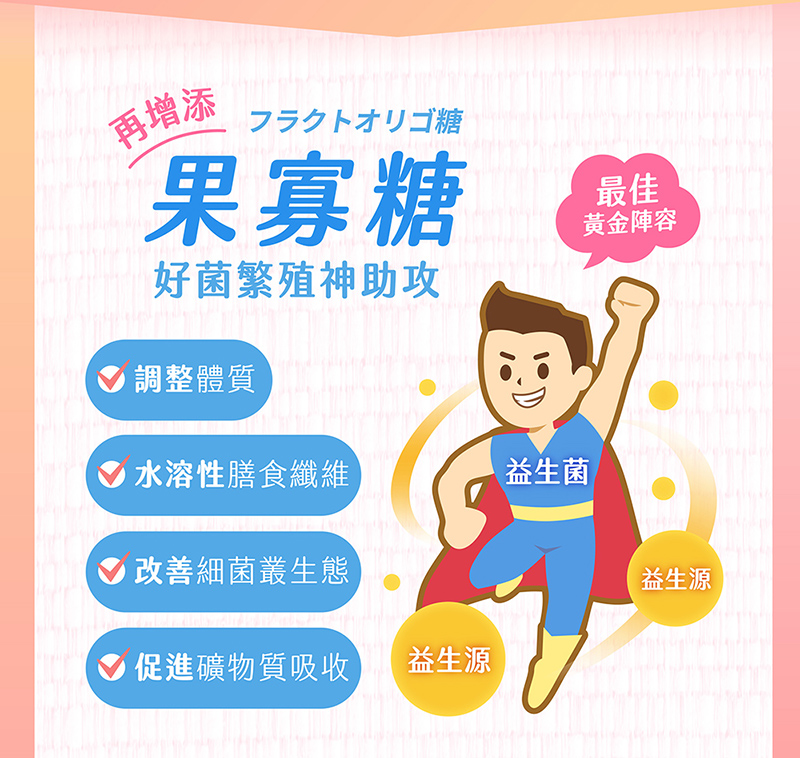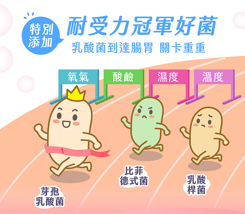 ◉特別添加「芽孢乳酸菌」及「益生源果寡糖」維持腸道的健康。