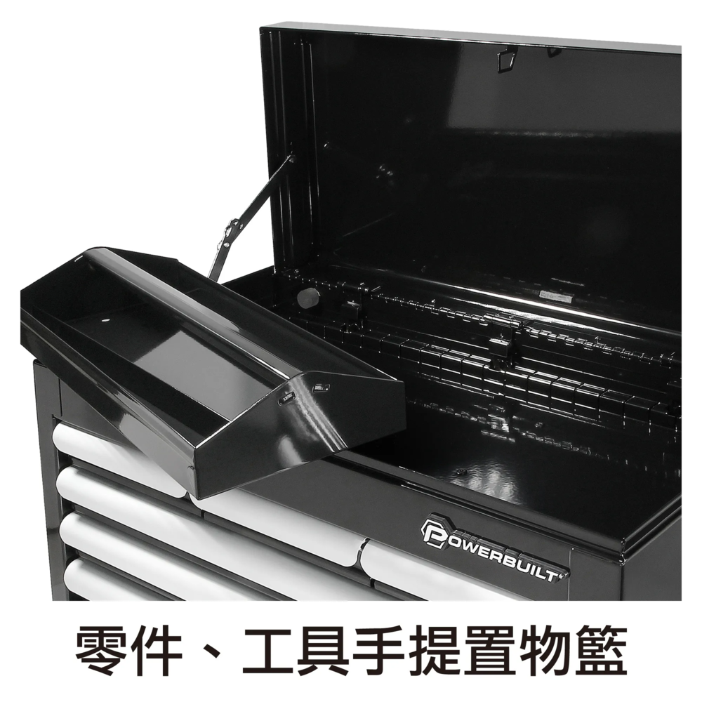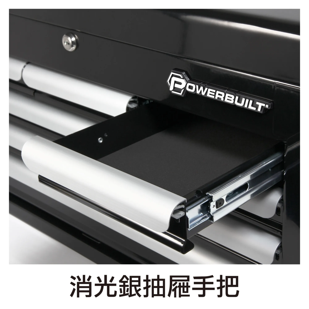 Powerbuilt專業六抽工具箱,產品使用工業等級黑色粉體塗裝烤漆,擁有耐磨、抗汙、方便清潔極佳特性。兩側採用符合人體工學的高光金屬手把,方便移動、搬運工具箱。帶有鑰匙的中控鎖設定,安全的保護工具與重要物品。最上層掀蓋全展開設計,讓收納空間達到最大化,並附贈置物隔板,可以照自己的需求規劃合適小型置物格,存放零件與小型工具。三大三小的收納抽屜,使用鋼珠滑軌機械結構,開關毫不費力。隨工具箱附贈的手提工具置物架,方便攜帶必要工具到指定工作地點。