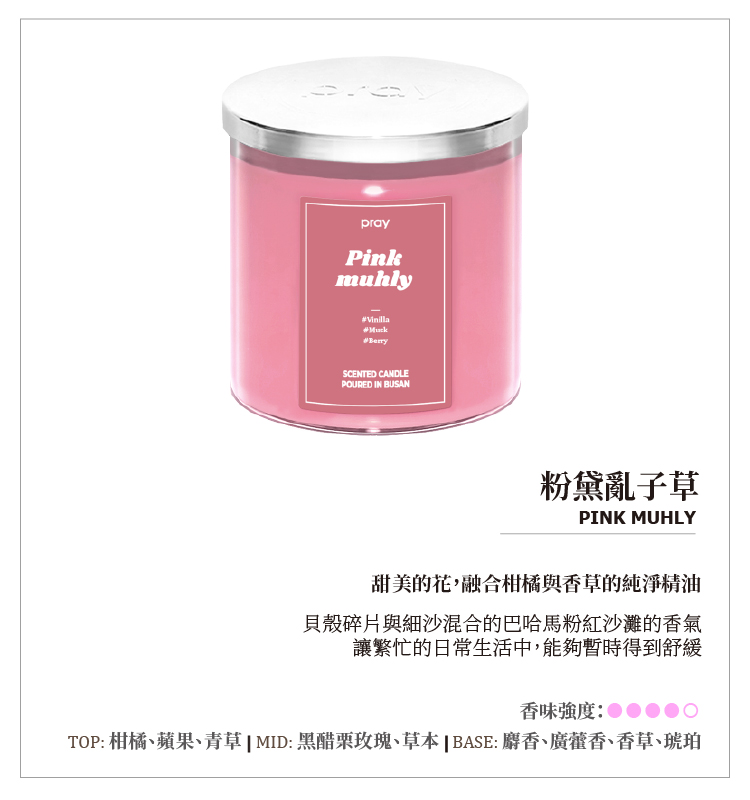 品名:PRAY韓國經典天然香氣蠟燭系列 - 桃花鼠尾草成分:草本、柑橘、麝香、100%大豆油容量:(L) -480g, 16.93oz ; (S)-165g, 5.82oz尺寸:(L) -直徑 10 cm ; (S)-直徑 7 cm商品使用時間:(L) -大約100小時 ; (S)-大約50-60小時用途:除臭、除濕、空氣清新自家檢驗號碼:KC: E-A09B-B005002-A170,SGS: KC/2019/30118製造國:韓國