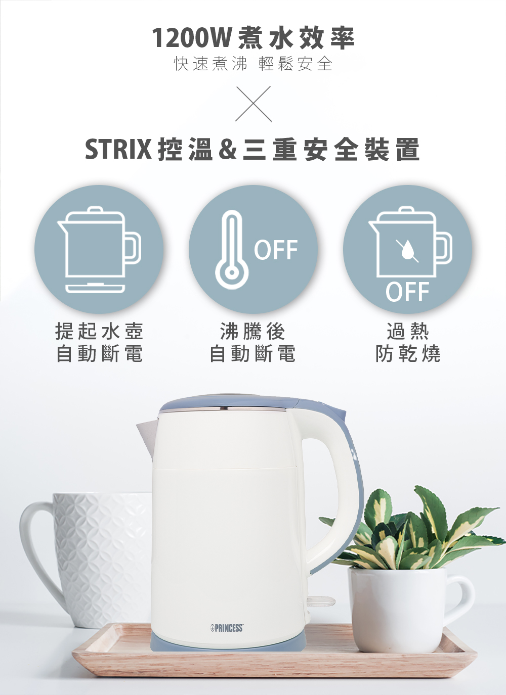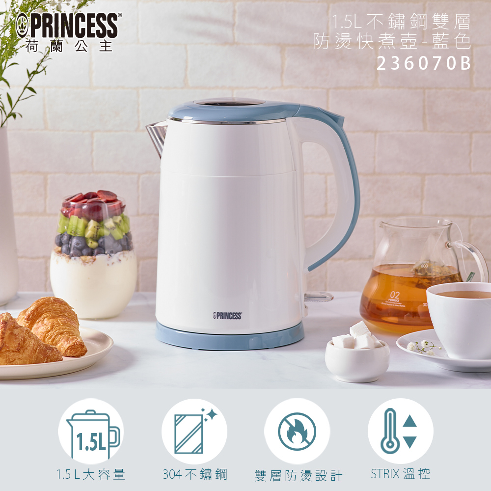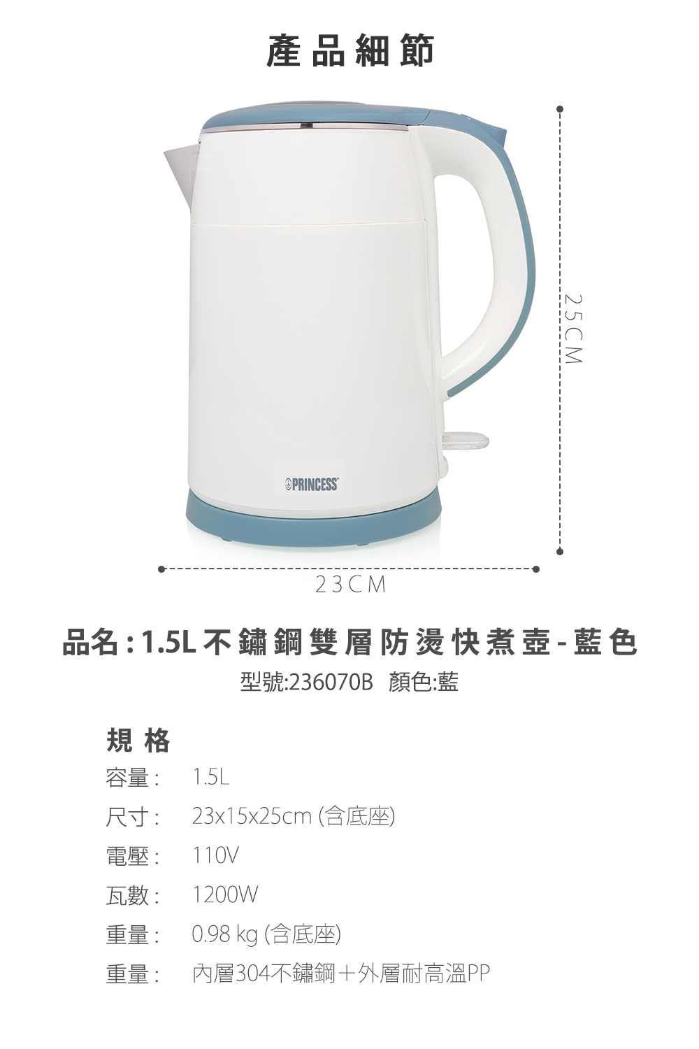 【商品特色】● 1.5公升容量,1200W● 雙層防燙設計,安全不燙手● 多重安全裝置,沸騰後、拿起水壺自動斷電● 貼心濾孔設計,水不會一次衝出● 採用STRIX恆溫裝置● 壺身360度旋轉,壼座分離無線式設計● 底盤有電源線收納裝置【商品規格】品名:荷蘭公主不鏽鋼雙層防燙快煮壺-藍型號:236070B電壓:110V功率:1200W尺寸:24*15*26cm重量:0.98kg設計:荷蘭設計產地:中國製造配件:水壺、底座、說明書、內頁附保卡保固:主機保固1年(將發票或出貨單與保卡一起保留,即可視為購買憑證)商品驗證碼:R3A130※加熱底座及壺身底部與加熱器接觸的地方,不可用水沖洗。※一但煮水使用過,恕不接受退換。