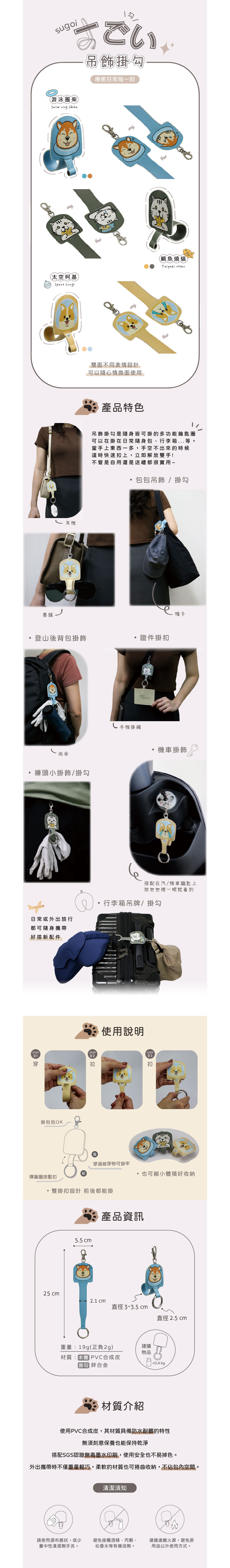 隨心所欲 想掛哪就掛哪 *吊飾兼具掛勾功能*SGS認證無毒印刷,安全使用*PVC合成皮材質,防水、耐用且耐髒*亦可當行李箱吊牌,且可掛隨身小物*雙面不同表情設計,可隨心情隨意更換【尺寸/重量】25*5.5cm(±1cm)/19g(±2g)【材質】本體:PVC合成皮掛勾:鋅合金【產地】台灣 【注意事項】①清潔商品時使用濕布擦拭,或少量中性清潔劑手洗②避免接觸酒精、丙酮、松香水等有機溶劑③除了水分,應避免鋅合金掛勾接觸到香水、化妝品、清潔劑等化學物質,這些物質也可 能導致褪色和損壞④如果掛勾不慎沾濕,應立即用乾布擦乾,並存放在乾燥的地方,以減緩氧化的速度⑤商品建議遠離火源,盡量避免原用途以外的使用方式➅商品以手工製作有些許誤差皆為正常範圍➆若物品較重請自行評估並確認扣環是否有扣緊,建議物品重量不超過0.4公斤